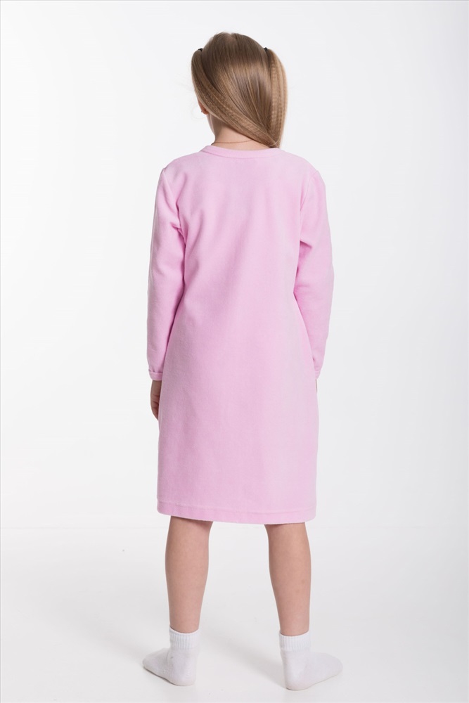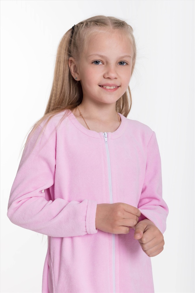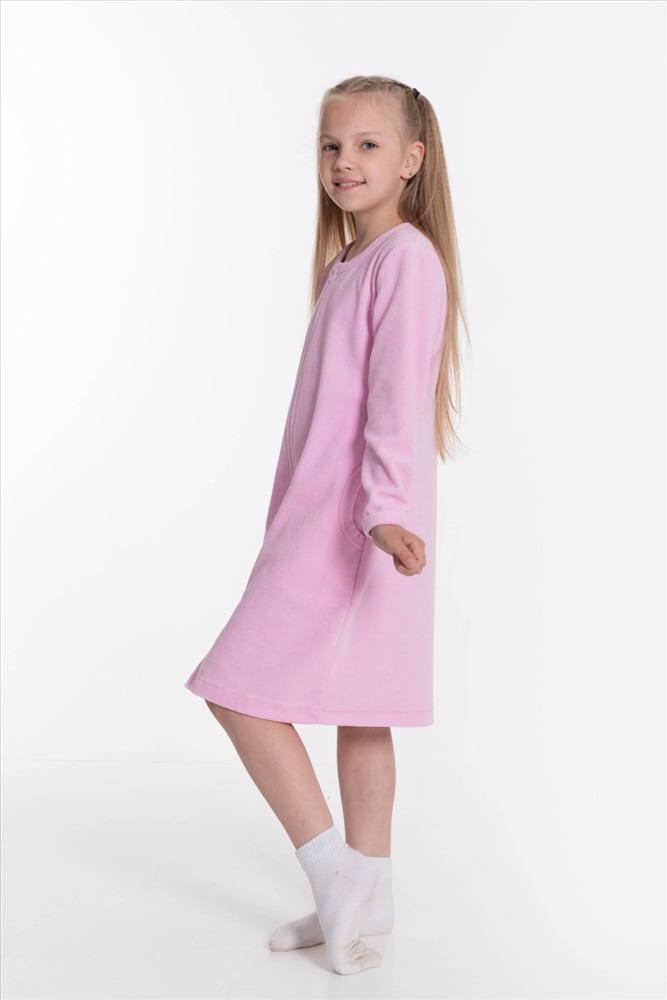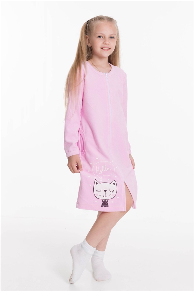 Халат с длинными рукавами выполнен из велюра. Центральная застёжка на молнию, по бокам расположены два кармана. Спереди на халате нанесён принт.