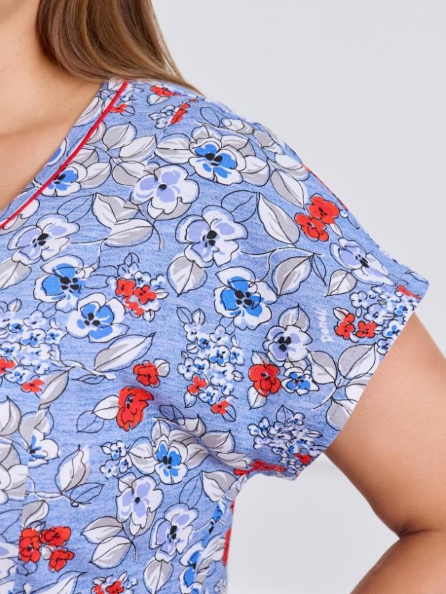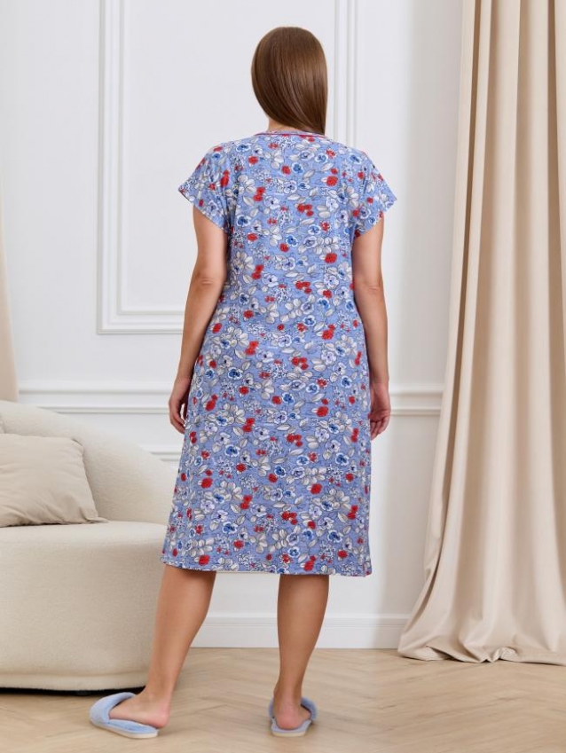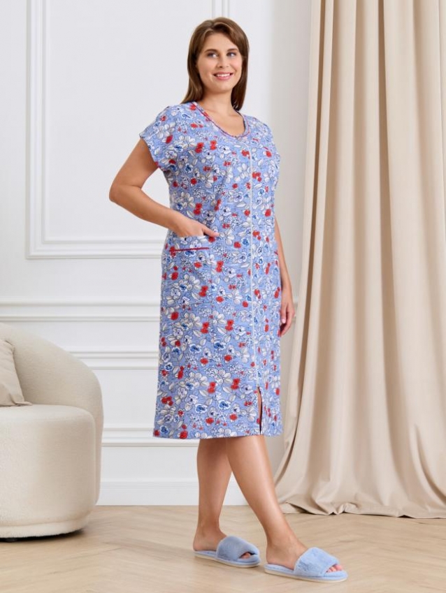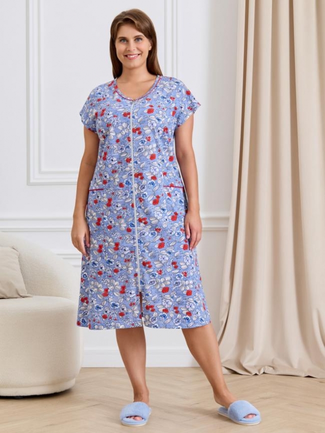 Халат женский из трикотажного полотна «кулирка» с набивным рисунком, свободного покроя, расширенный к низу, короткими цельнокроеными рукавами, горловиной овальной формы, окантованной двойным кантом, центральной бортовой застежкой на тесьму «молния». Полочки с рельефными швами, карманами на уровне беде. Верхние срезы карманов обработаны притачными планками с кантом.