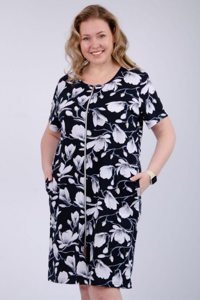 Женский халатик на молнии самая распространенная и универсальная одежда для домашнего отдыха и хозяйственных хлопот. После трудного рабочего дня, приходя домой, первым делом хочется переодеться. И данная модель это идеальный вариант среди представительниц прекрасной половины человечества. Модель выполнена из 100% хлопчатобумажной ткани.