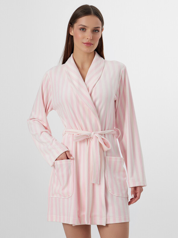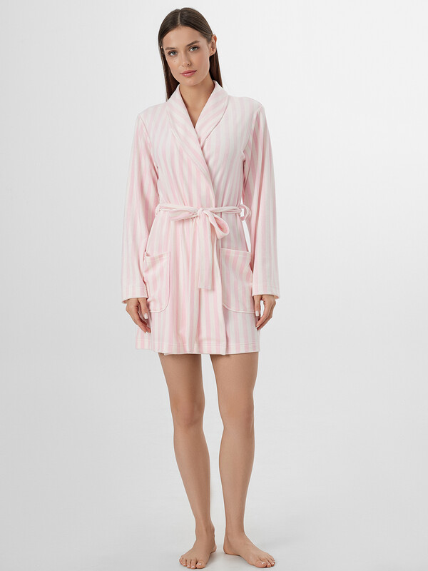 Халат прямого силуэта, длина выше колена. Спинка цельнокроеная. На уровень талии в боковой шов настрочены завязки из тесьмы. Концы тесьмы завязываются. Обтачной пояс заправлен в шлевки на боковых швах, на уровне талии. По переду настрочены накладные карманы с закруглением по низу. Верхний срез карманов застрочен. Рукава втачные, длинные. По краю борта проложена отделочная строчка. Посередине горловины спинки настрочена фирменная вешалка.