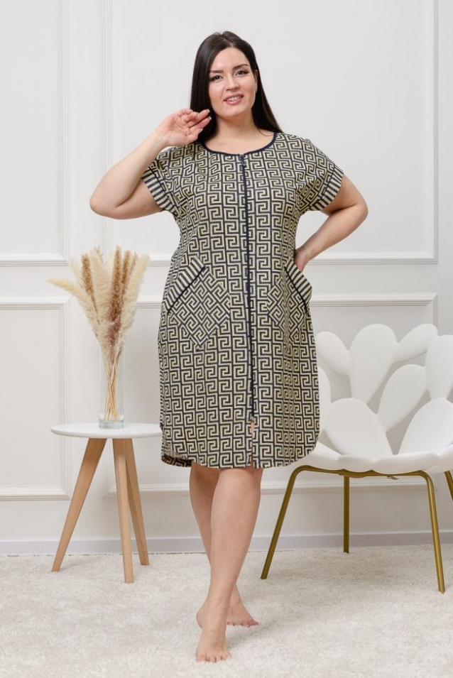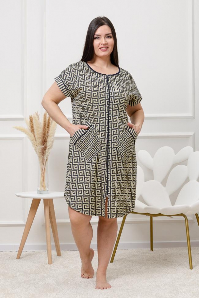Халат на молнии, прямого силуэта, длиной выше колена, с фигурной линией низа, с удлиненной спинкой, с округлой горловиной, с накладными карманами с обтачкой из отделочного полотна. Рукав цельнокроеный, короткий, с манжетом из отделочного полотна. Горловина обработана бейкой из контрастного полотна.