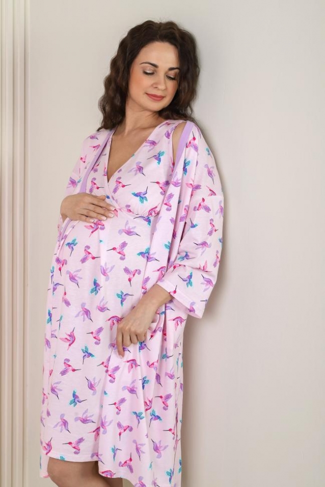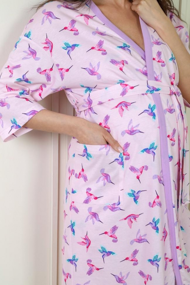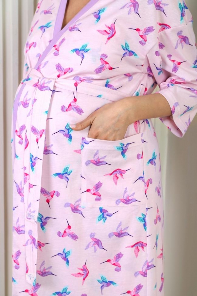 Параметры модели на фото (рост, Ог-От-Об): 170, 87-67-94 Халат из трикотажного полотна кулирного переплетения с набивным рисунком эксклюзивного дизайна. Модель на запАх, с боковыми карманами, рукавами длиной 3/4. Борта и горловина окантованы однотонным полотном. Съёмный пояс фиксируется на завышенной линии талии при помощи двух шлевок в боковых швах. Комментарии к товару