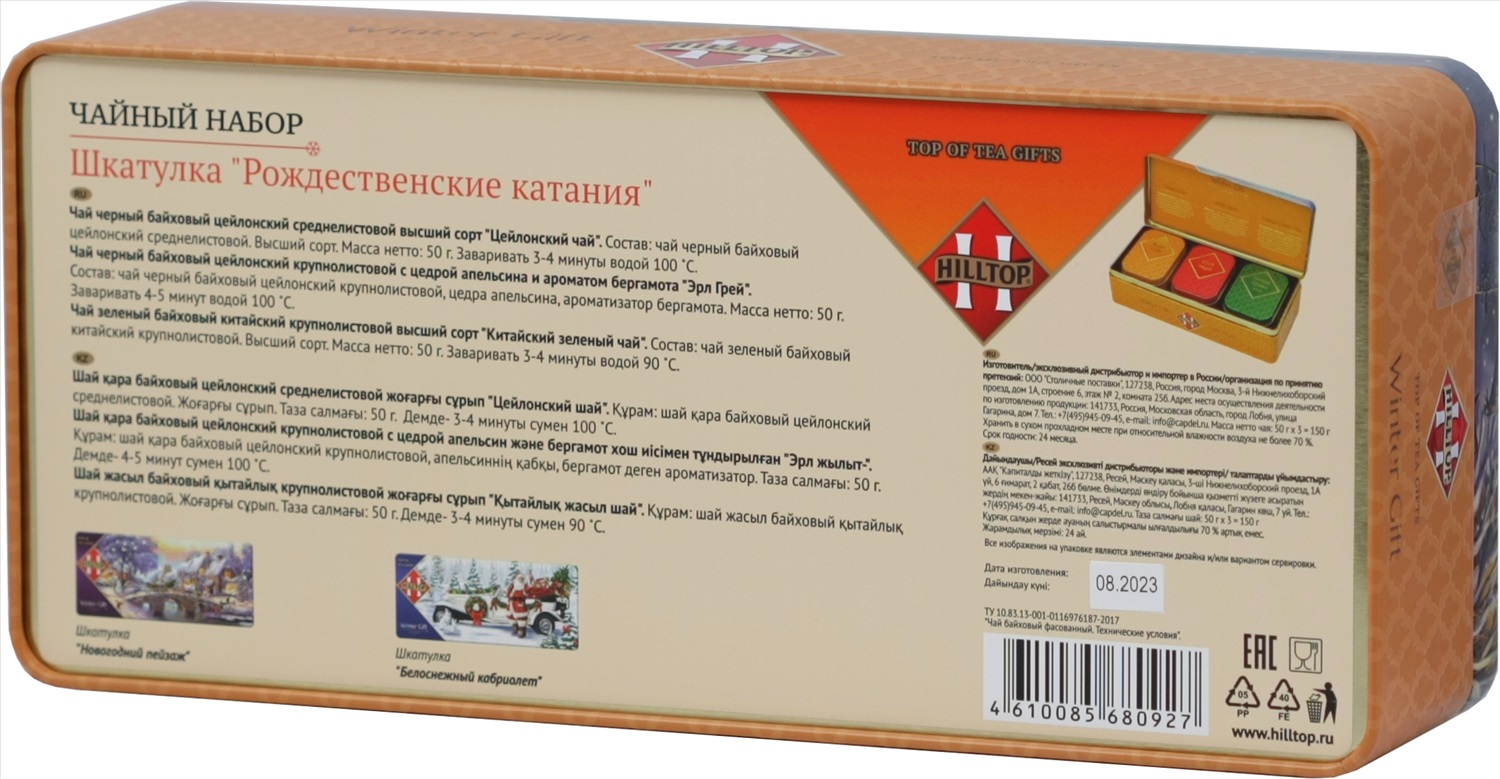 Подарочная шкатулка в авторском зимнем дизайне, внутри которой 3 жестяных баночки с отборными, высшими сортами чая:1. Черный среднелистовой цейлонский чай «Цейлонский чай» - 50 грамм. Регулярное употребление напитка замедляет старение клеток и укрепляет иммунитет.2. Черный крупнолистовой цейлонский чай с цедрой апельсина и ароматом бергамота «Эрл Грей» — 50грамм. Имеет приятный цитрусовый аромат и сладковатый вкус.3. Зеленый крупнолистовой китайский чай «Китайский зеленый чай» - 50 грамм. Нежный и освежающий купаж, при заваривании раскрывается тонкими цветочно-травяными вкусовыми нотами.Будьте уверены, такая чайная шкатулка станет лучшим подарком на Новый 2026 год или Рождество!
