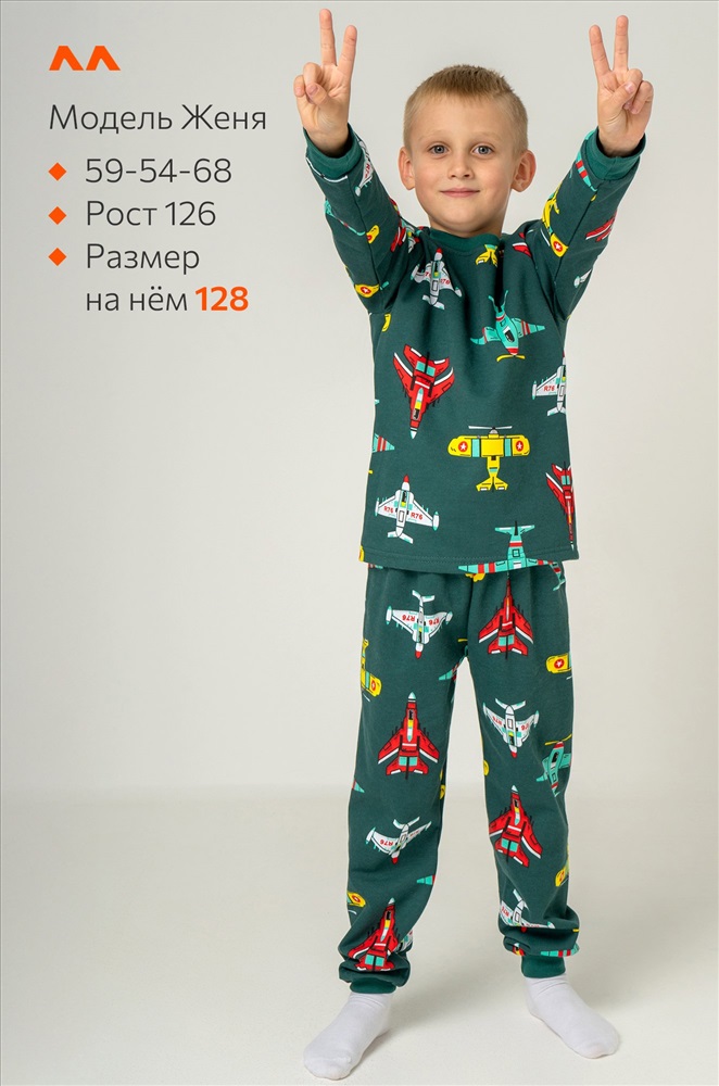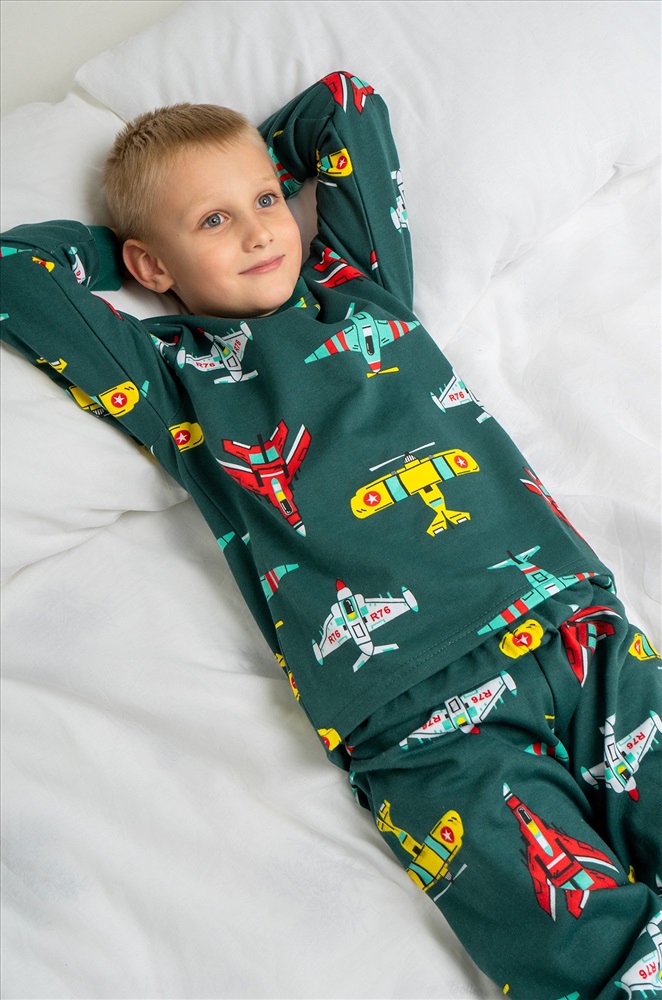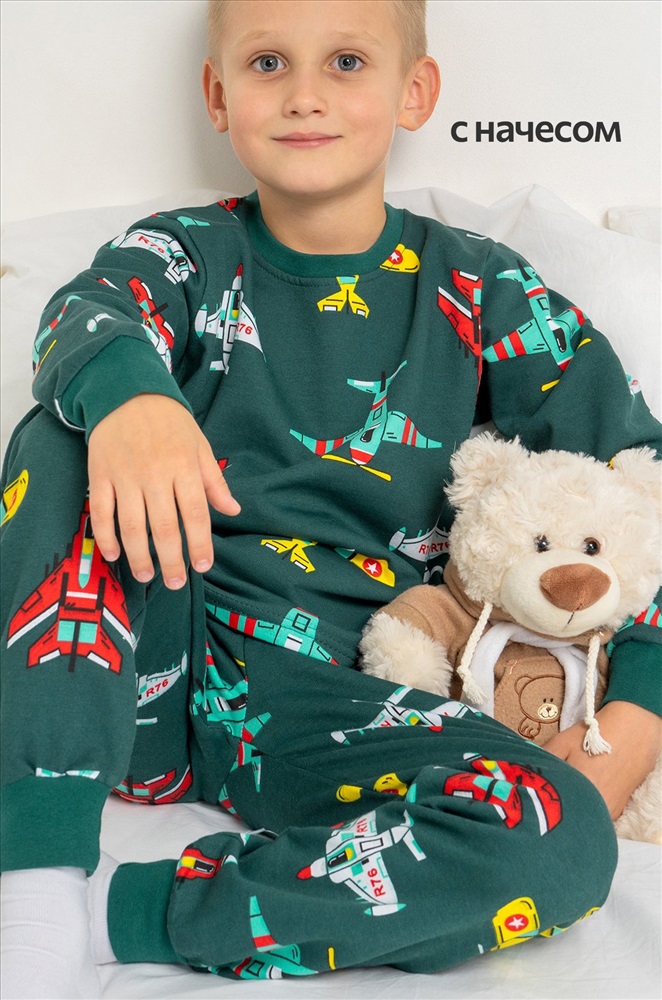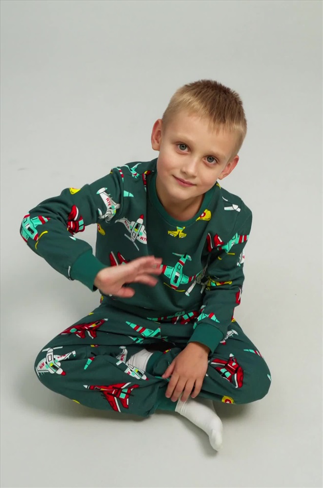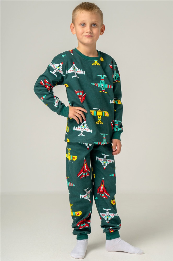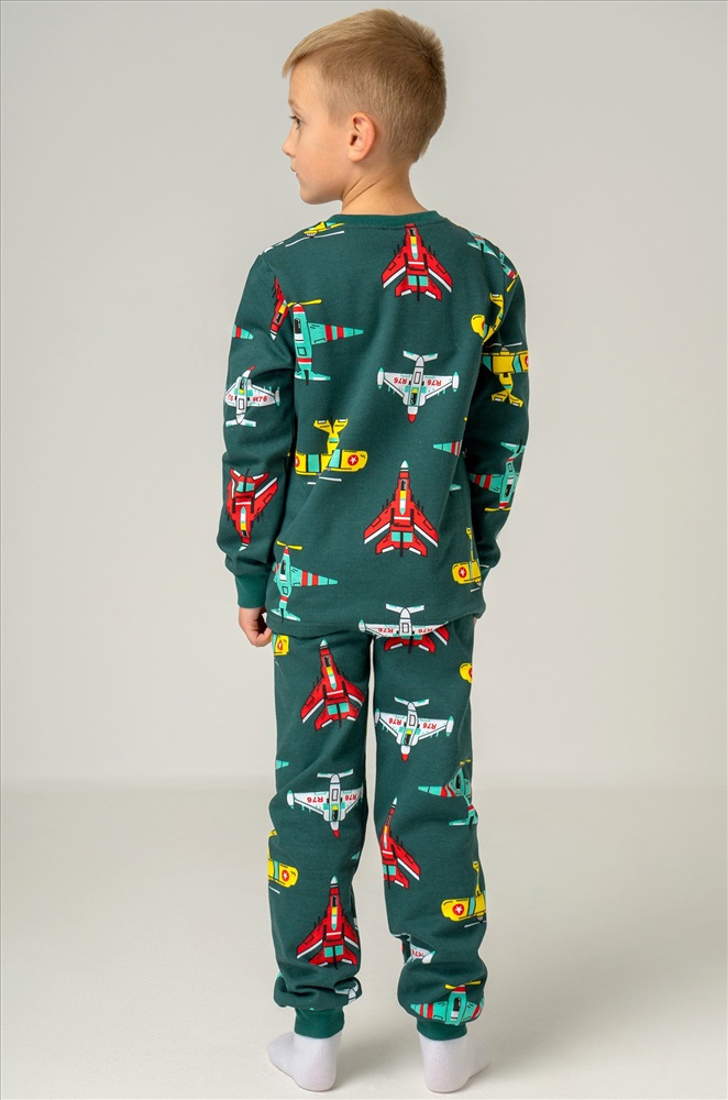 Теплая детская пижама с брюками для мальчиков выполнена из 100% хлопка. Пижама из футера с начесом станет любимым атрибутом отдыха благодаря свободному крою и симпатичному дизайну. Пижамка украшена принтом самолеты.