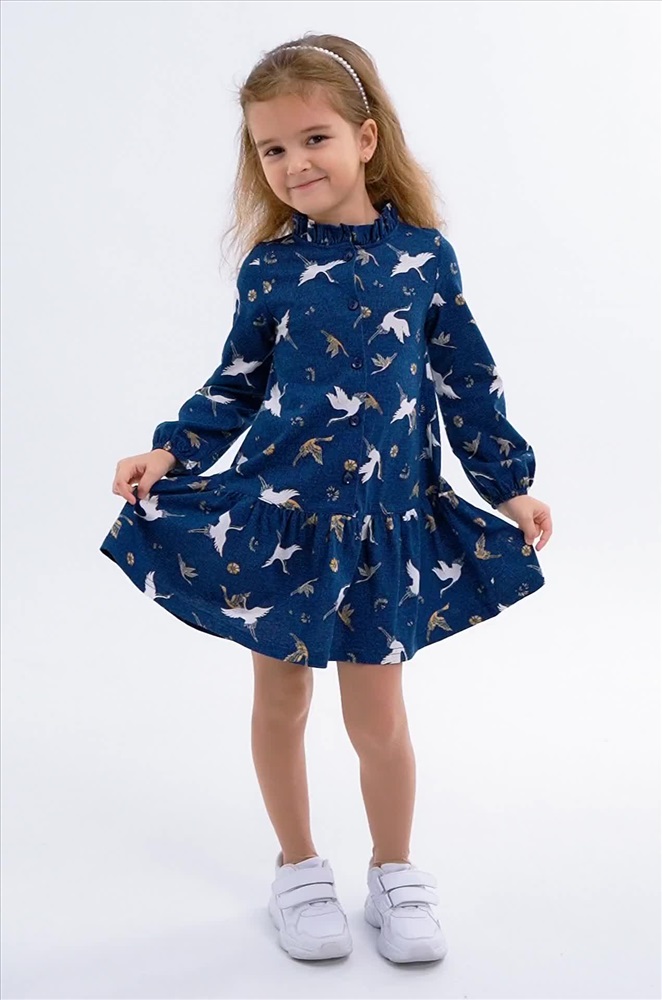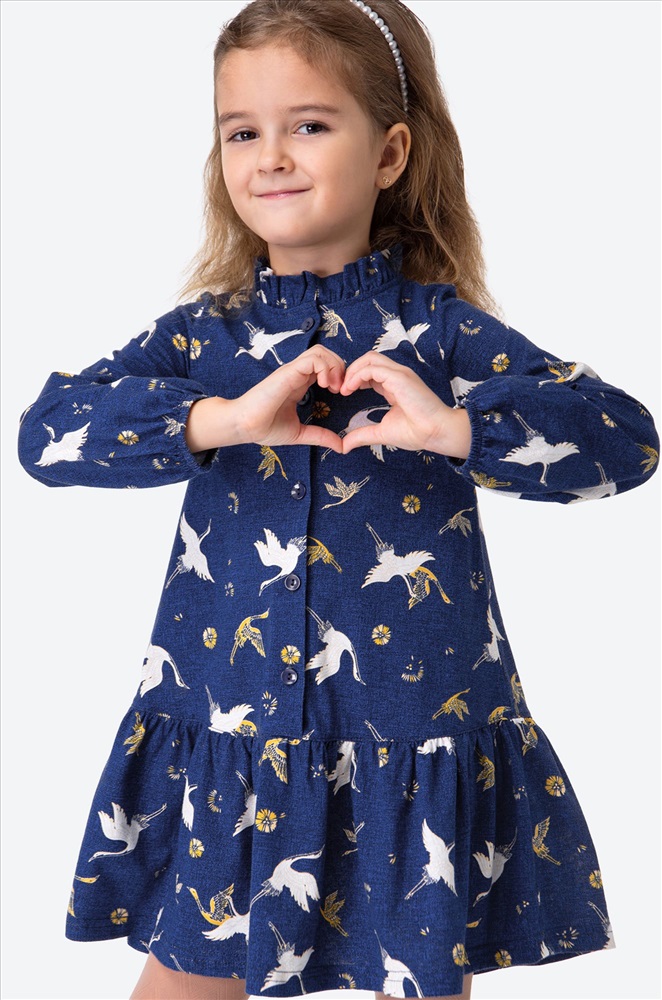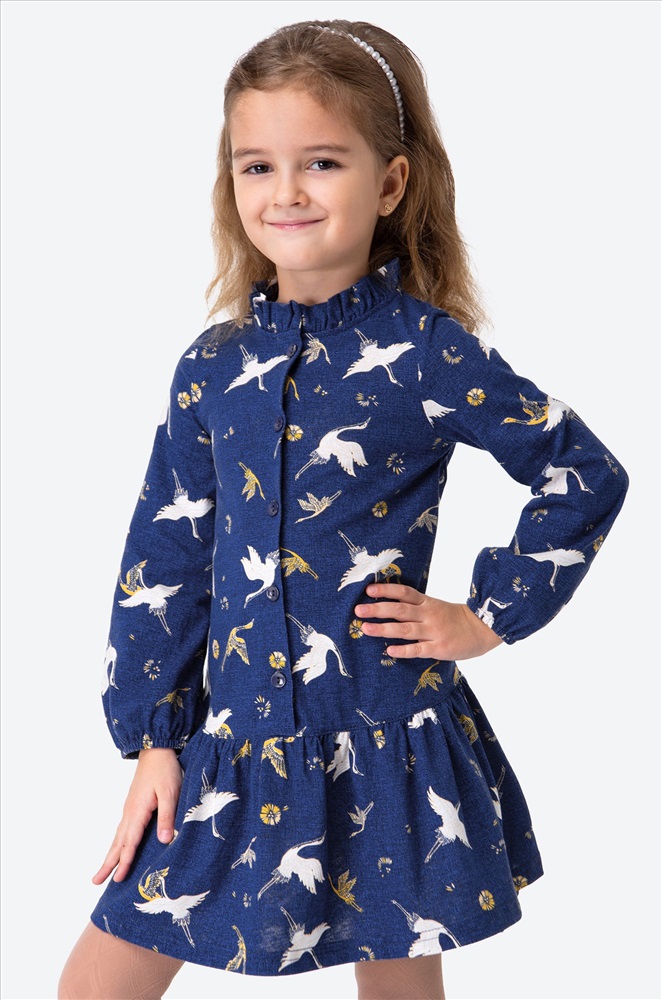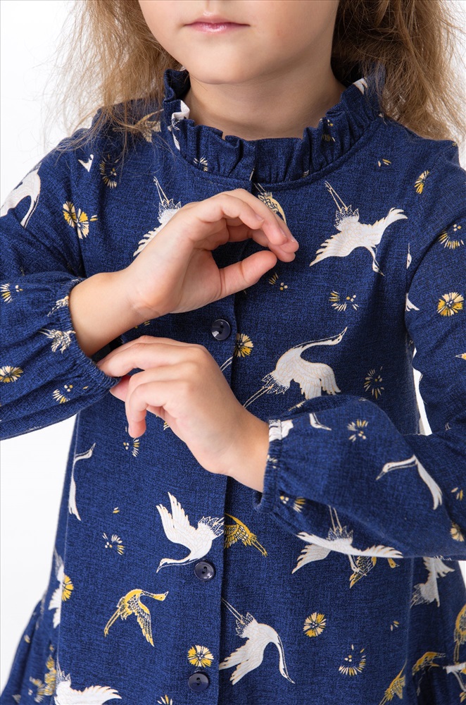 Детское синее платье для девочки выполнено из натурального 100% хлопка. Свободный крой, длинный рукав, удобная застежка на пуговицы – каждая деталь создана для комфорта ребенка. Благодаря классному принту журавли, кокетливому воротнику-стойке и воздушным сборкам на юбке девочка будет чувствовать себя принцессой в любой ситуации.