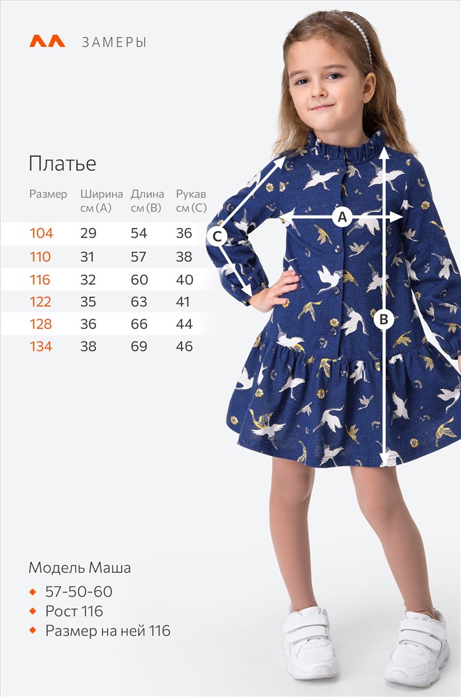 Модель Маша, ее рост 116 см, параметры 57-50-60 см. На ней платье размера 116.