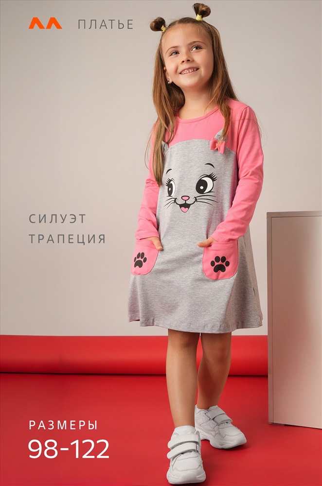 Преимущества: – хлопковое полотно с добавлением лайкры — мягкость и эластичность; – демисезонное — отлично подходит для осени и весны; – милый принт Кошка и карманы с рисунком лапки; – трикотажный супрем — приятный к телу и не сковывает движений; – идеально на каждый день и в детский сад. Силуэт трапеция делает это расклешенное платье удобным и воздушным. Трикотажное платье с длинным рукавом отлично подойдёт как весенний или осенний вариант для прогулок, в гости и для дома. Рост модели 114 см, параметры: объем груди 52, объем талии 53, объем бедер 60 см. На ней размер 122.