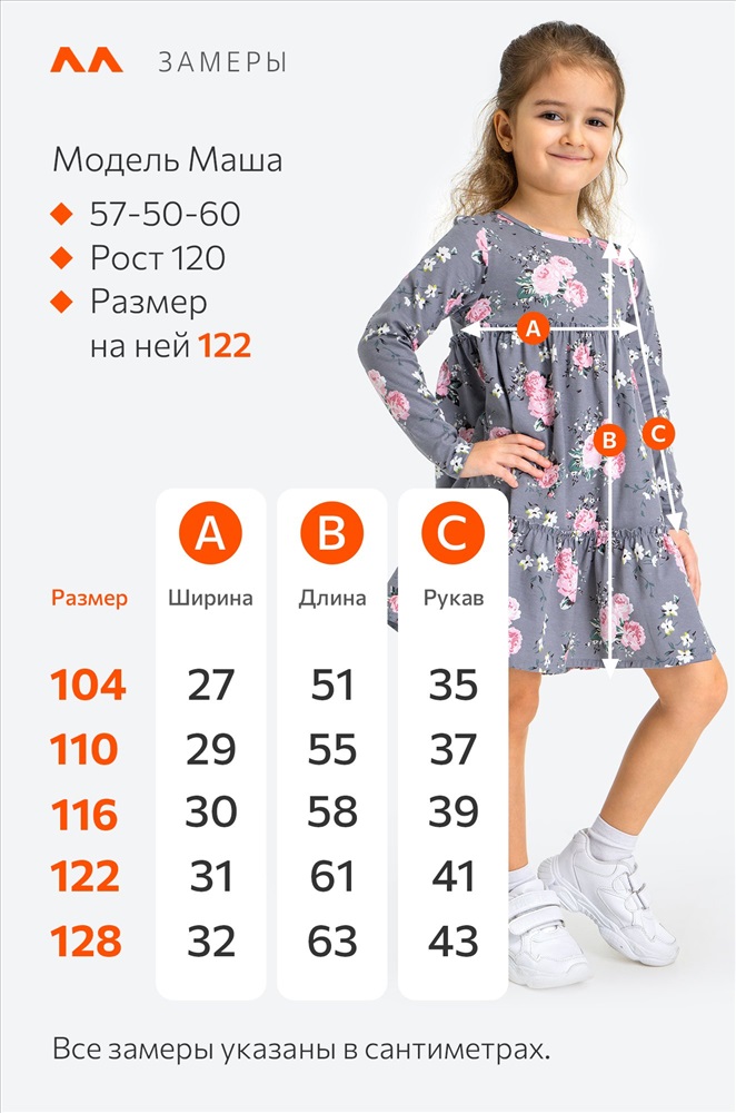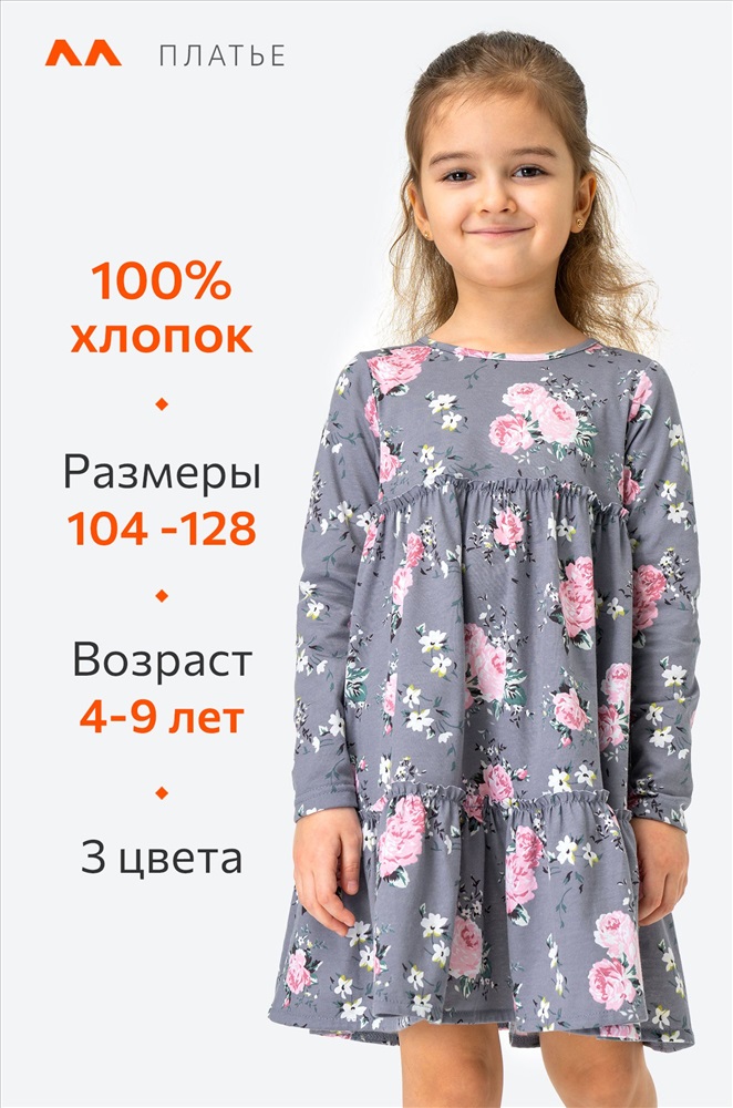 Нарядное платье выполнено из легкой трикотажной ткани кулирная гладь, которая делает его идеальным для жаркого лета и осени. Серое платье выдерживает многократные стирки, сохраняя форму и цвет. Хлопковое платье не сковывает движений благодаря свободному силуэту трапеция и комфортной длине выше колена. Расклешенная юбка в крупную складку делает образ легким и воздушным, а застежка на пуговицах на спинке добавляет ему сдержанности. Короткое платье с рисунком в цветочек поможет создать стильный образ для повседневных прогулок и детского сада. Оно подойдет для летних поездок, праздников и активного отдыха весной. Красивое праздничное платье идеально для утренников и мероприятий. Модель подойдет для осенних и весенних дней. Модель Маша, рост 120 см, параметры 57-50-60 см. На ней платье из трикотажа размера 120.
