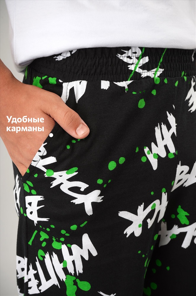 Преимущества: — 100% натуральный хлопок — мягкость и воздухопроницаемость; — свободный крой — комфорт в движении; — эластичный пояс и карманы — удобно и практично; — уникальный принт в стиле граффити добавляет динамики и яркости. Трикотажные шорты идеальны на каждый день. Удлиненные хлопковые бриджи — отличный выбор для дома. Рост модели 147 см, параметры: объем груди 69, объем талии 59, объем бедер 75. На нем размер 146.