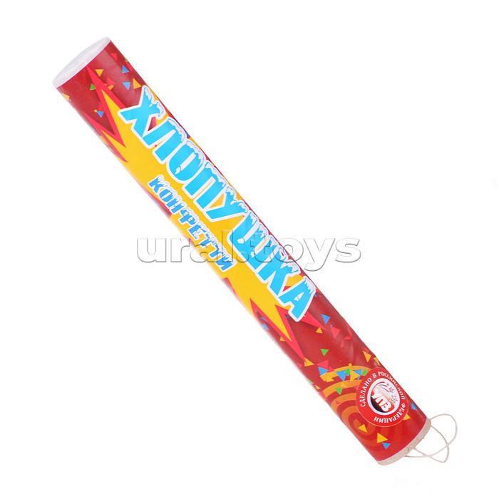 Эффект: хлопок и выброс конфетти долго парящего в воздухе. Габаритные размеры изделия: длина — 200 мм, диаметр — 27 мм.