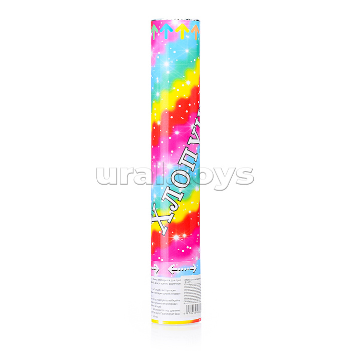 • Эффект: хлопок и выброс фольгированного конфетти. • Не является пиротехникой: выстрел происходит за счет сжатого воздуха. • Инструкция указана на упаковке. • Размеры хлопушки: 5х5х30 см. • Изготовлено из картона, фольги и полимерных материалов. • Соответствует требованиям безопасности продукции.