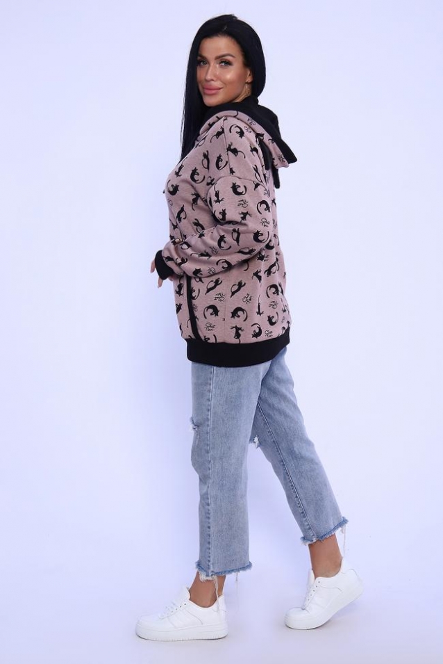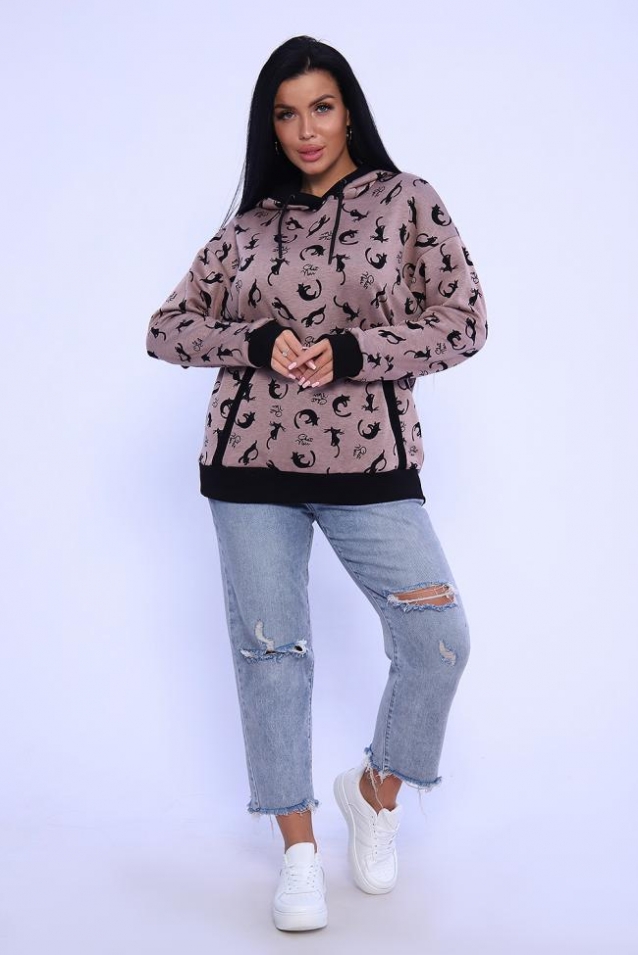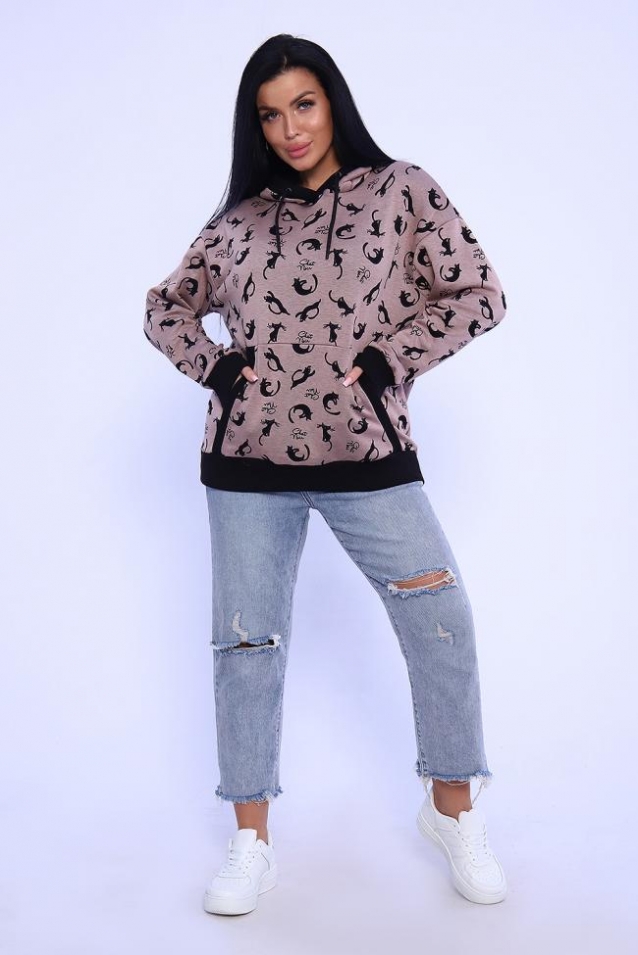 Молодёжная толстовка-худи из теплого трикотажа на меху. Толстовка в свободном стиле-оверсайз с удобным карманом-кенгуру, спущенная пройма, длинный рукав, капюшон с игривыми ушками. Низ джемпера, манжеты, капюшон и вход в карман-кенгуру обработаны эластичной кашкорсе. Стильная, комфортная толстовка не стесняет движения, отличный вариант для занятия спортом, а так же для прогулок в холодное время года.