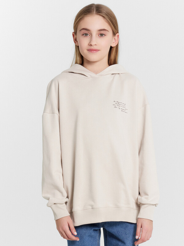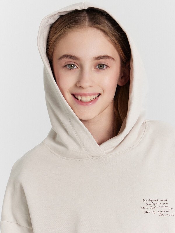 Стильное худи оверсайз для девочек, созданное из трикотажного футера с теплым подчесом. Такой материал обеспечивает мягкость, комфорт и тепло, делая эту модель идеальным выбором для прохладных дней. Крой с комфортным капюшоном и длинными рукавами с манжетами сочетает в себе практичность и стиль. Спущенная линия плеча дарит дополнительную свободу движений и комфорт, делая это худи еще более уютным.