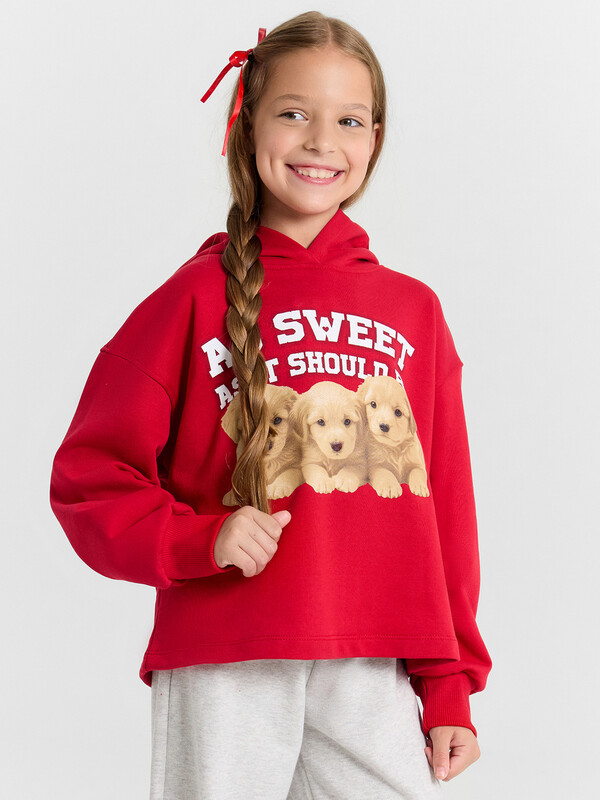 Худи укороченный прямого силуэта с капюшоном. Рукава длинные, втачные.