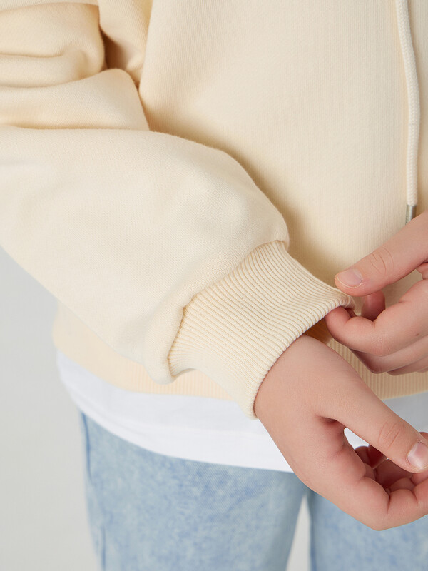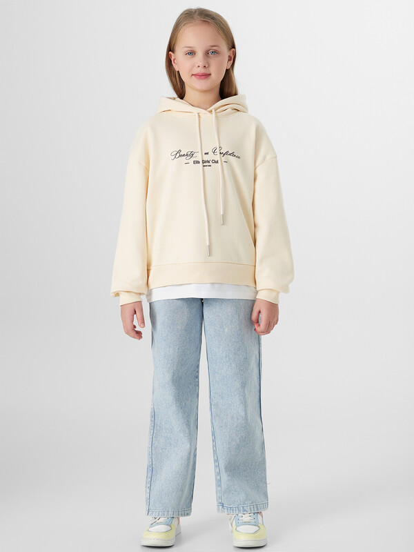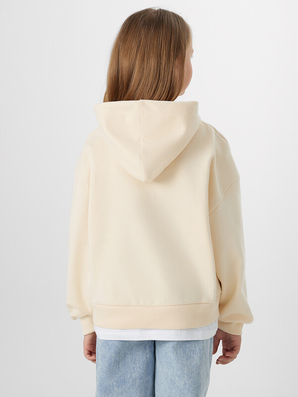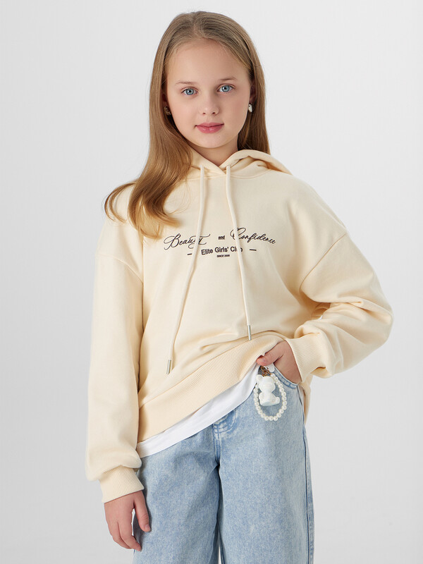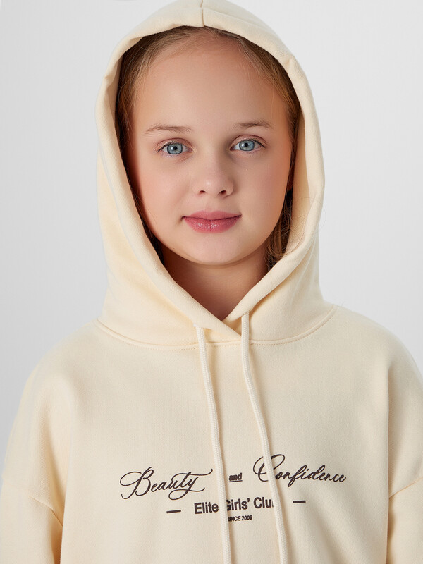 Худи для девочек, свободного силуэта (оверсайз), с капюшоном. Горловина округлой формы. Капюшон со средним швом, на подкладке из основного полотна, в капюшоне пробиты петли и втянут шнур, круглый с наконечником (арт. 8NMKXWC-1). Плечо спущено, рукав втачной длинный. По низу рукава отрезная манжета из рибаны. Пояс отрезной из рибаны, отстрочен.