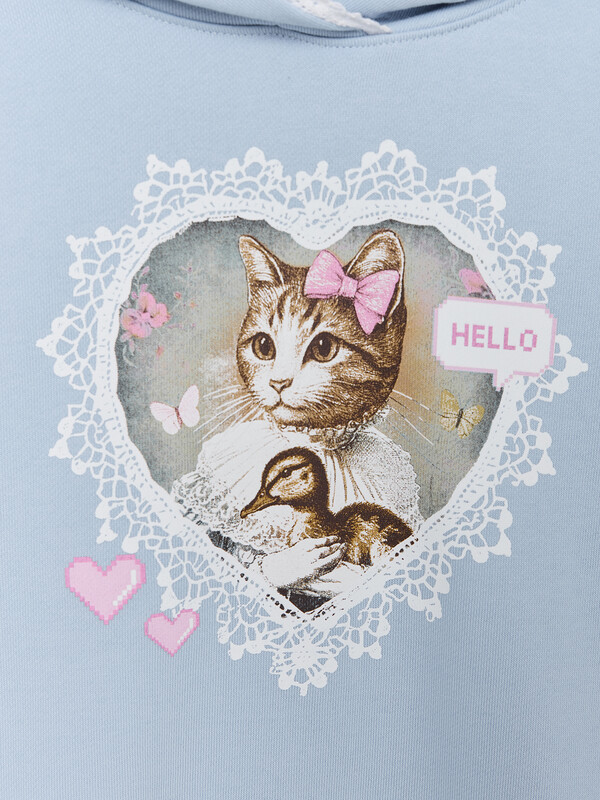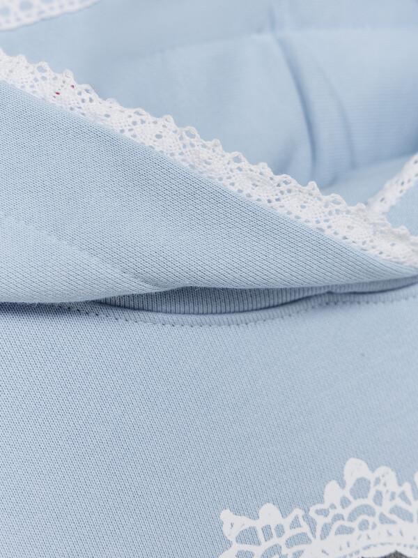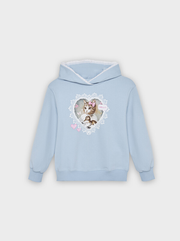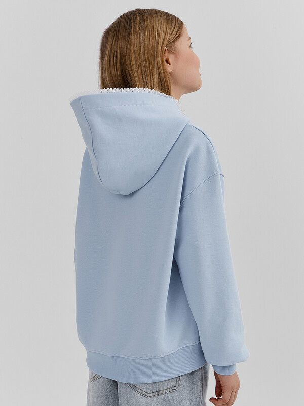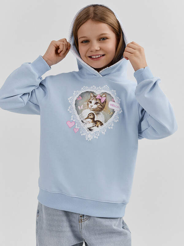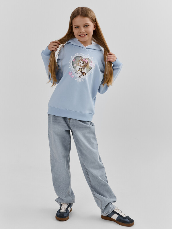Худи для девочек, прямого силуэта, с капюшоном. Горловина округлой формы. Капюшон со средним швом, на подкладке из основного полотна. По краю капюшона с внутренней стороны настрочена отделочная тесьма (6361-1176). Плечо спущено, рукав втачной длинный. По низу рукава отрезная манжета из рибаны. Пояс отрезной из рибаны, отстрочен.