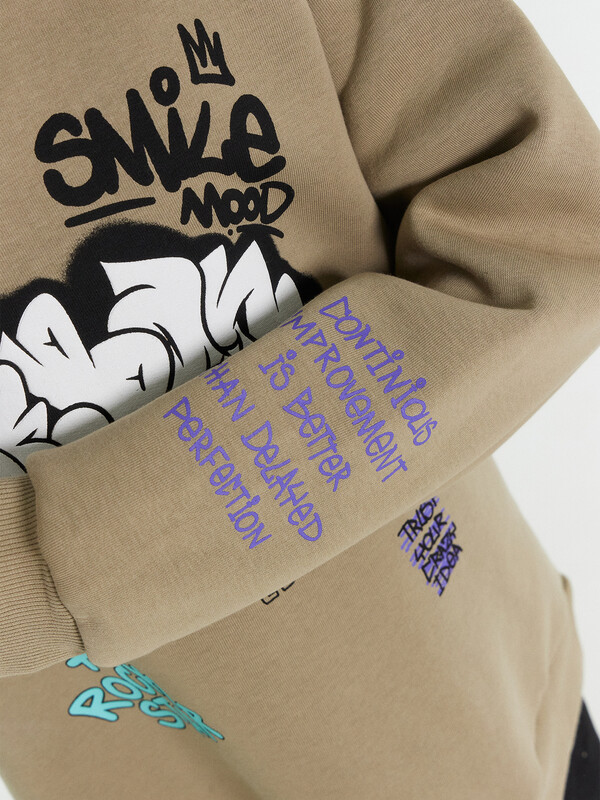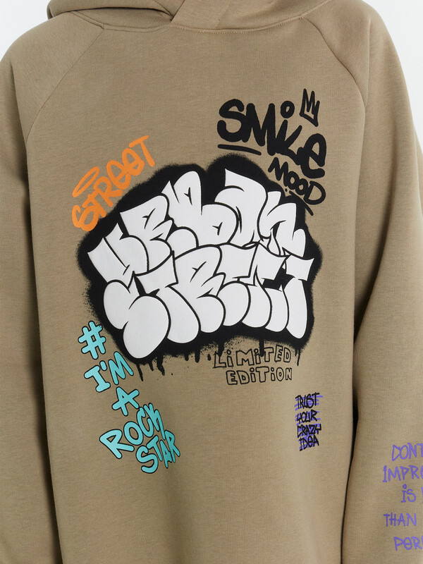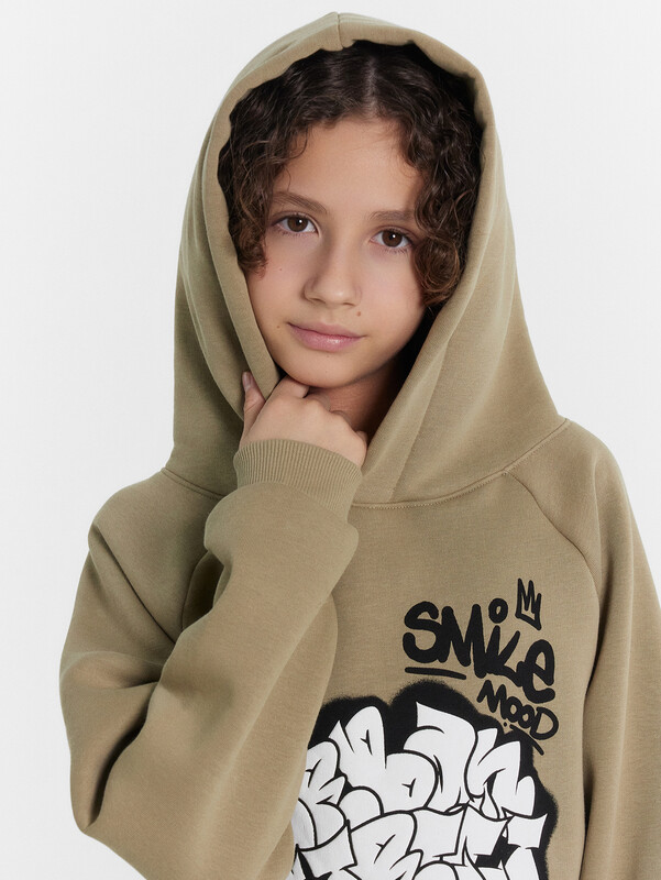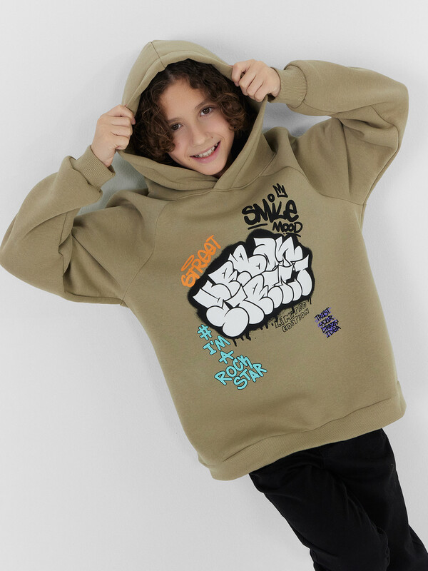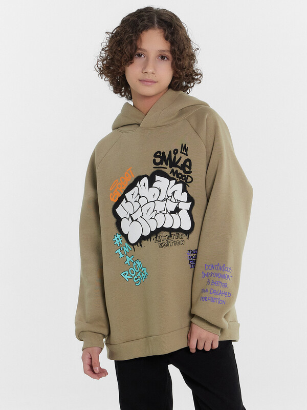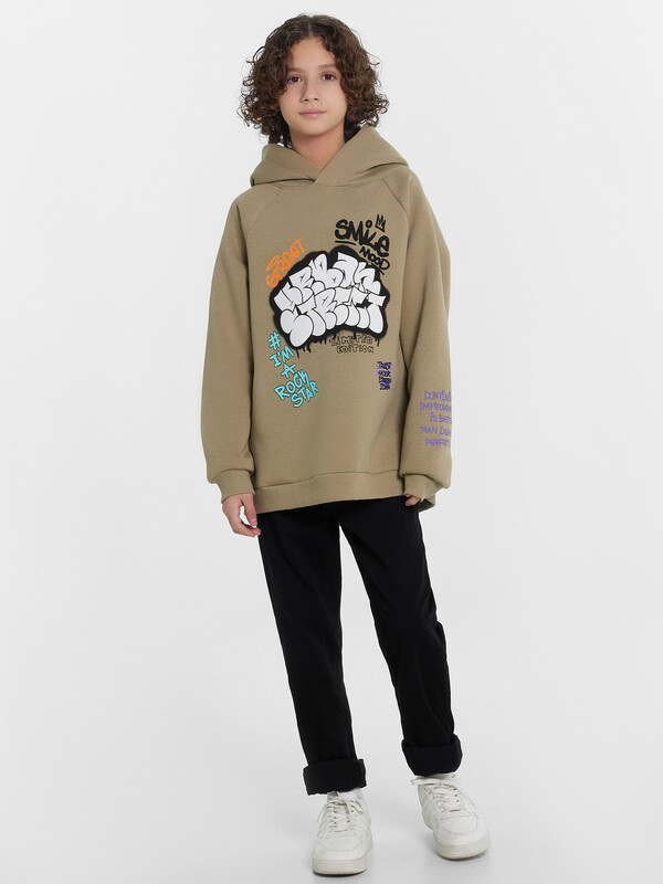 Утепленное худи для мальчиков, выполненное из дегкого трикотажного футера. Силуэт прямой, расслабленный. Вырез круглый, с объемным капюшоном. Рукава длинные и объемные, с манжетами. Мальчику наверняка понравятся принты и цвет этого худи
