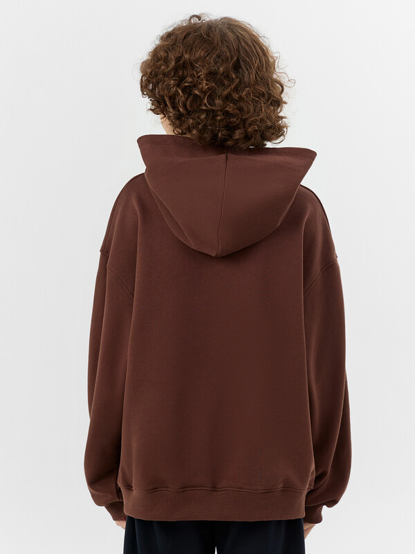 Свободный крой со спущенной линией плеч и длинными рукавами обеспечивает полную свободу движений. Капюшон со средним швом имеет подкладку из основного материала, а место его соединения с основной частью аккуратно обработано хлопковой тесьмой.