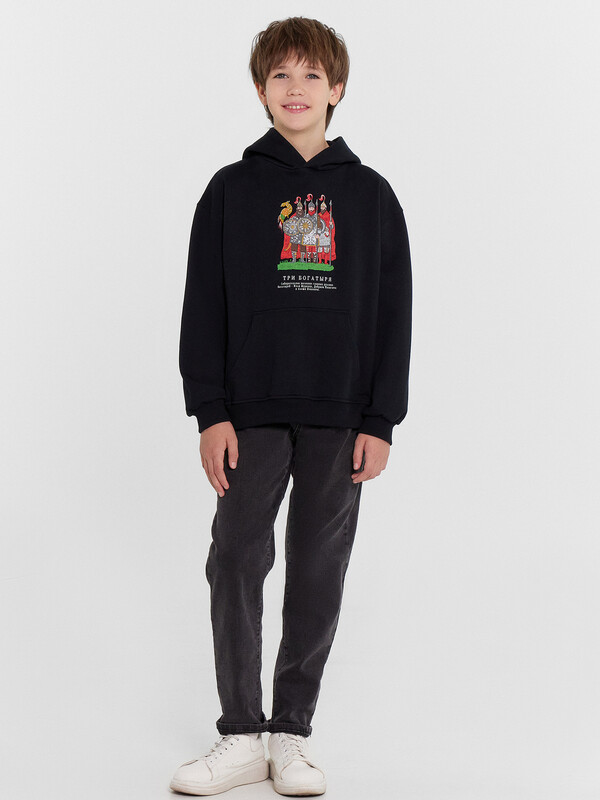 Стильное худи для мальчиков, идеально подходящее для повседневных образов. Модель свободного силуэта с капюшоном обеспечивает комфорт и стиль. Длинные рукава со спущенной линией плеча и эластичными манжетами гарантируют свободу движений и удобную посадку. Карман кенгуру спереди добавляет функциональности и современного стиля. Изделие выполнено из футера - плотного и прочного материала, который отличается хорошей теплоизоляцией и воздухопроницаемостью. Он сохраняет тепло, позволяя коже дышать, что делает его идеальным для прохладной погоды. Этот материал долговечен и устойчив к износу, что особенно важно для активных детей. Это худи станет любимым элементом гардероба каждого мальчика, сочетая в себе стиль, комфорт и практичность.