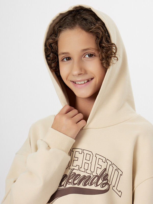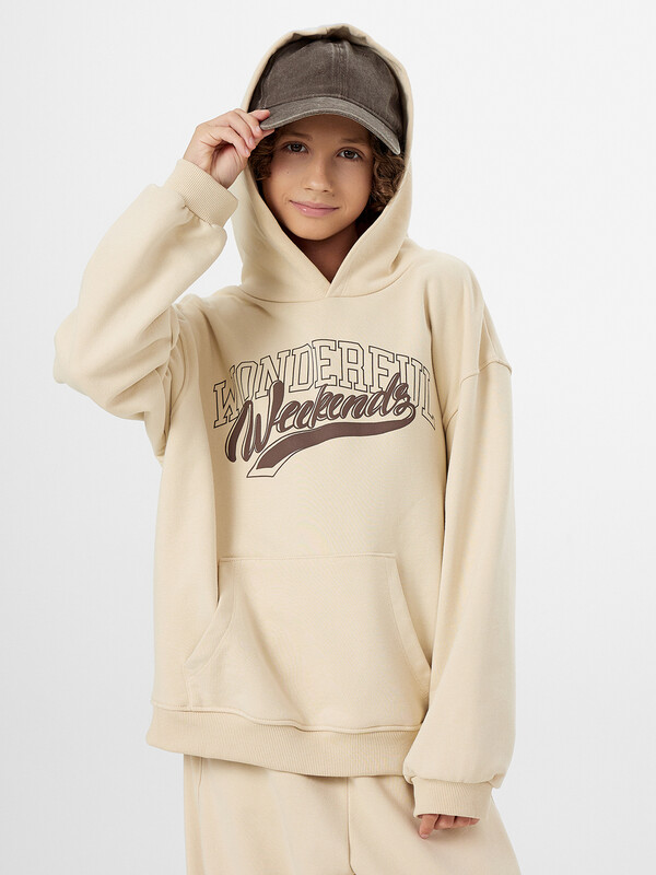 Худи оверсайз для мальчиков с надписью создано для активного образа жизни. Модель из хлопка отличается особой мягкостью и способностью пропускать воздух, что важно для подвижных детей.