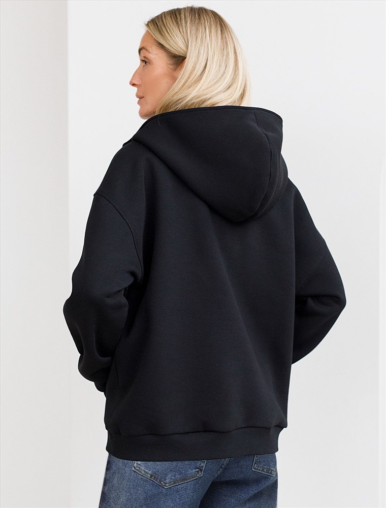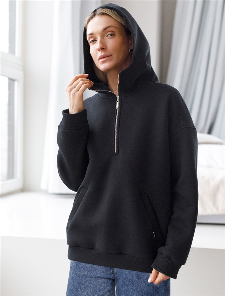 Худи с воротом на молнии выполнено из премиального футера трехнитки с теплым начесом. Модель дополнена боковыми карманами и золотистой фурнитурой, что поддерживает актуальный стиль спорт-шик. Свободный крой подходит для любой фигуры. Ранней осенью или поздней весной можно носить в качестве верхней одежды.