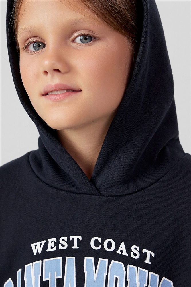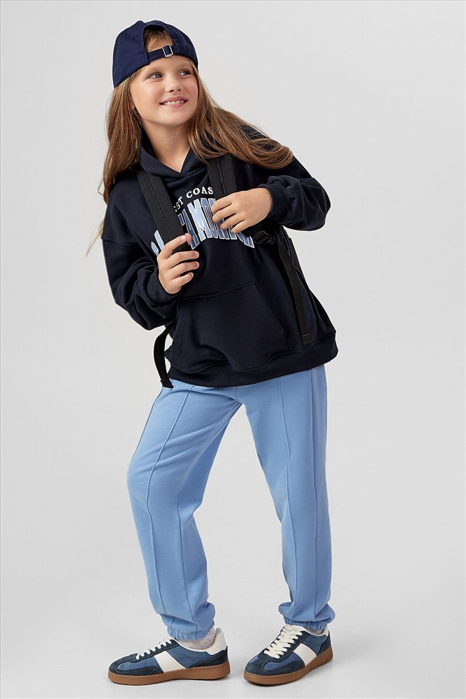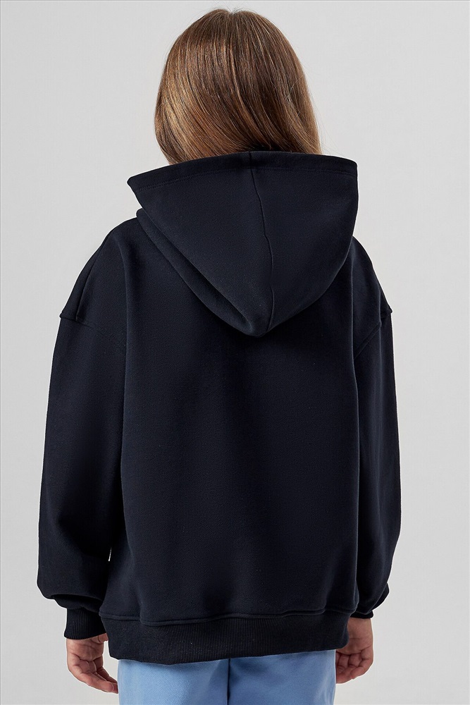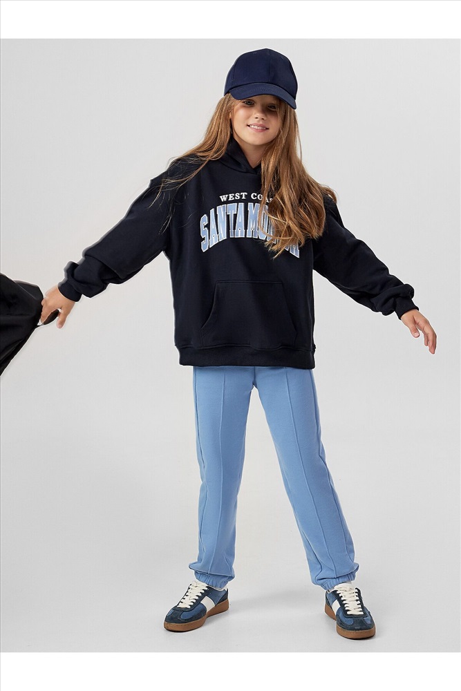 Худи для девочек, свободного силуэта (оверсайз), с капюшоном. Горловина округлой формы. Капюшон со средним швом, на подкладке из основного полотна. Шов втачивания капюшона закрыт хб тесьмой. Плечо спущено, рукав втачной длинный. По низу рукава отрезная манжета из рибаны. Пояс отрезной из рибаны, отстрочен. По переду карман кенгуру.