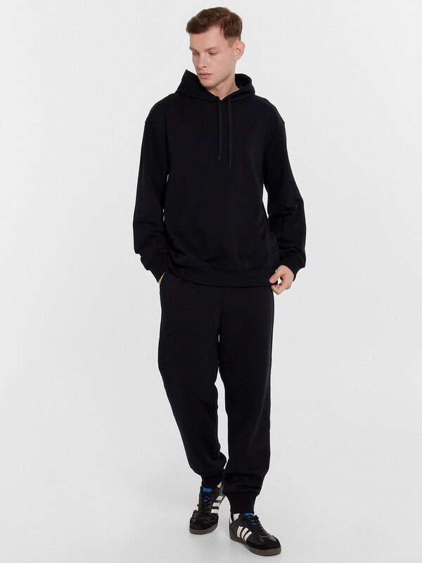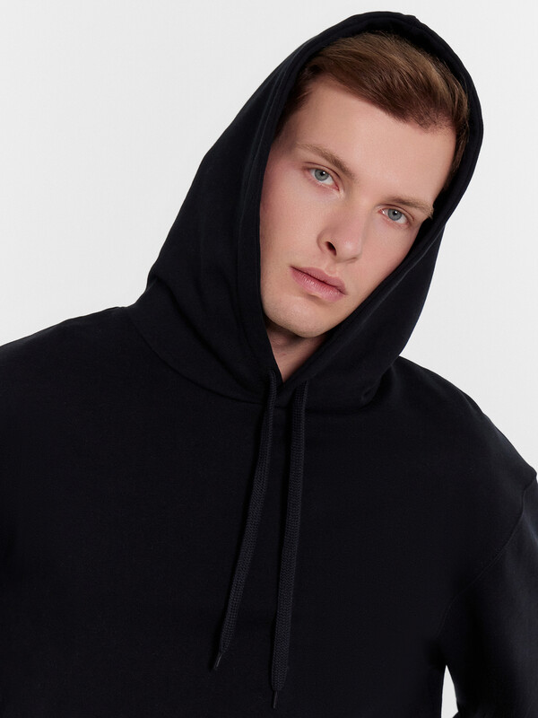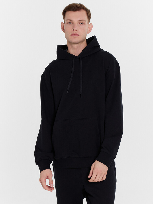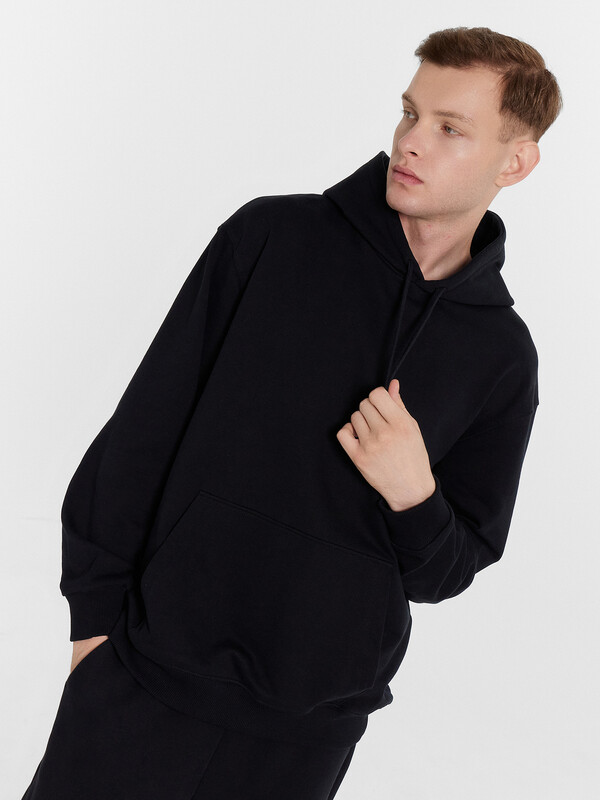 Хиди прямое свободное. Горловина округлой формы с капюшоном. Капюшон со средним швом на подкладке из основного полотна. На внешней стороне пробиты петли и втянут шнур (8КXW-1 8мм) с узлом на концах. Рукав втачной, длинный с отрезными манжетами из рибаны. Линия плеча спущена. По переду накладно карман кенгуру. По низу худи отрезной пояс из рибаны.