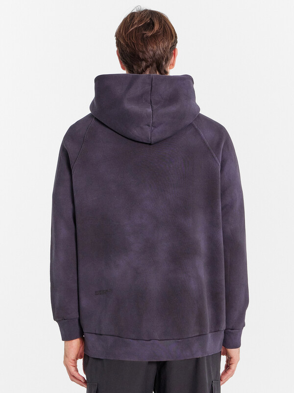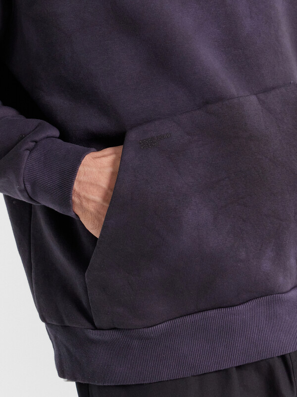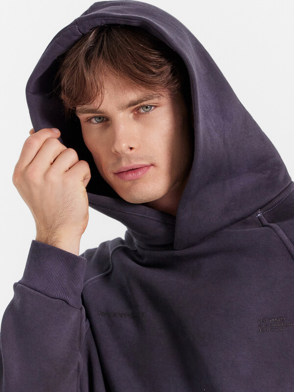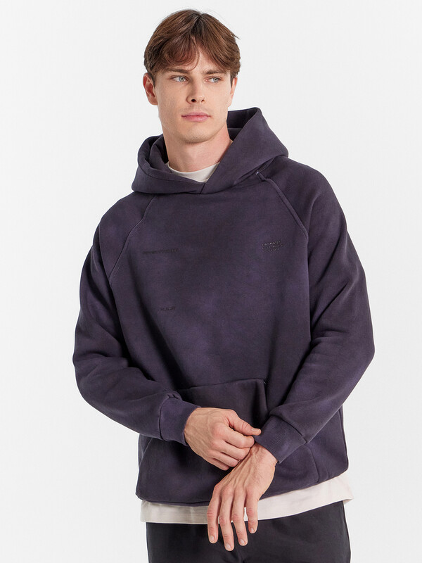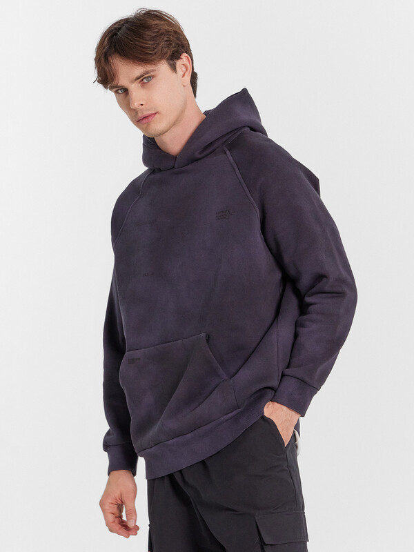 Мужское худи из трикотажного футера с теплым и нежным подчесом. Силуэт свободный, оверсайз. Вырез круглый, классический, с уютным капюшоном. Рукава свободные, с манжетами. Накладной карман-кенгуру и эластичный пояс из рибаны делают худи еще более уютным.