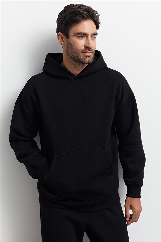 Мужское утеплённое худи свободного кроя из мягкого футера с начёсом, со спущенным плечом, длинными рукавами, капюшоном и карманом-«кенгуру» спереди. Манжеты и низ, оформленные рибаной в лаконичный рубчик, добавляют изделию текстурности и делают силуэт более графичным. Трикотажный материал на основе высококачественного хлопка хорошо пропускает воздух, приятно ощущается на теле и подходит даже для чувствительной кожи. Добавление полиэстера создает теплосберегающий эффект, а деликатная обработка швов обеспечивает дополнительный комфорт. Универсальное худи для повседневных образов: комфортное, тёплое и стильное решение на каждый день.