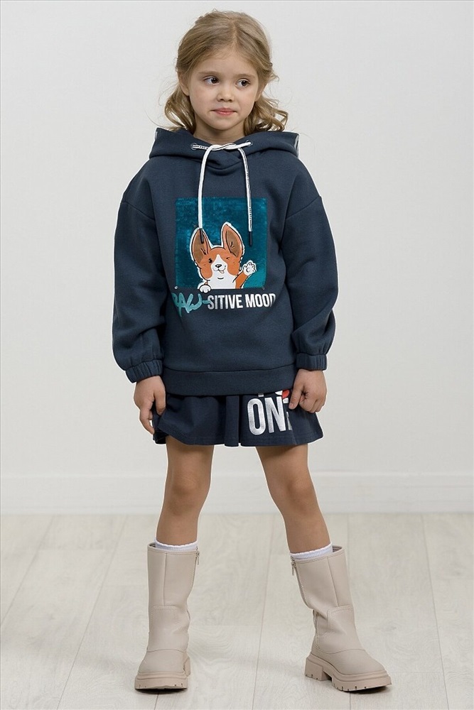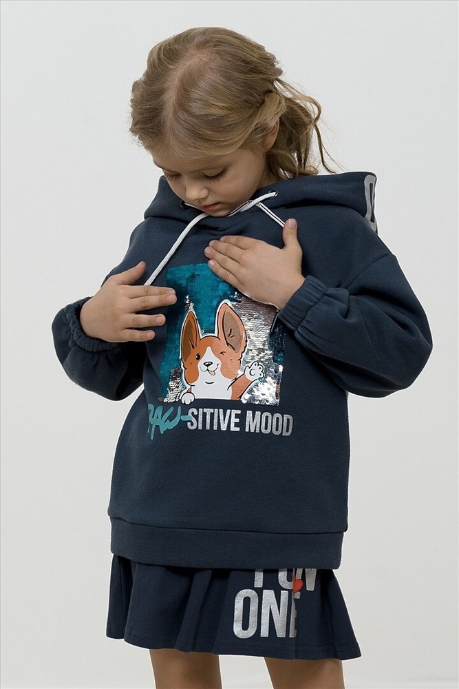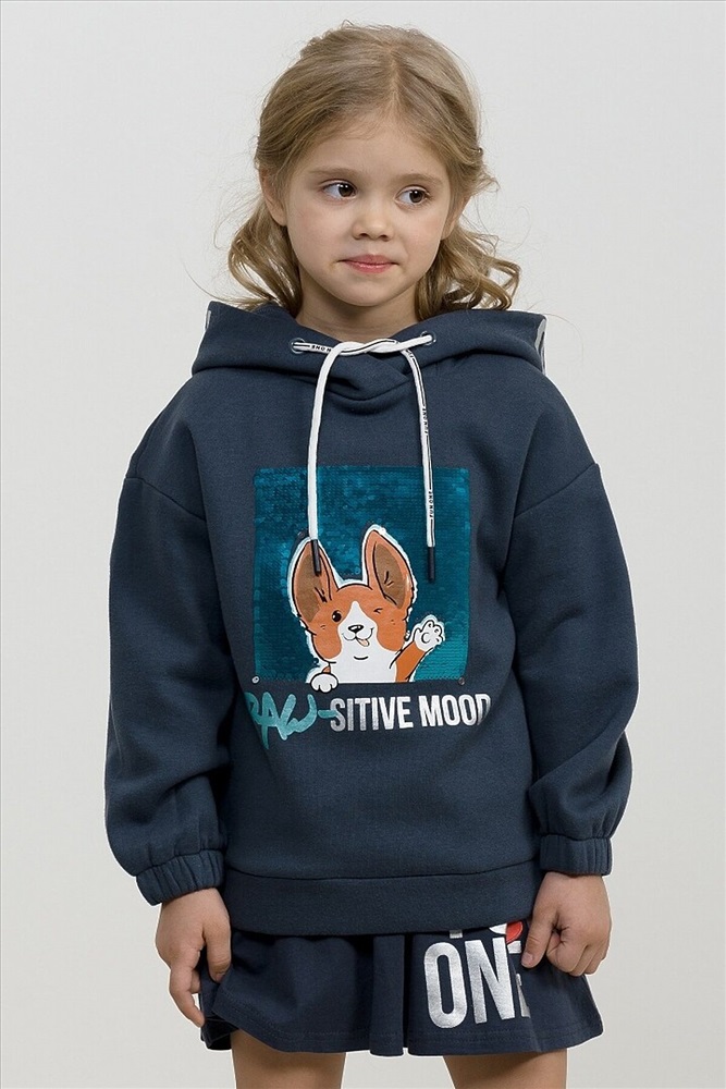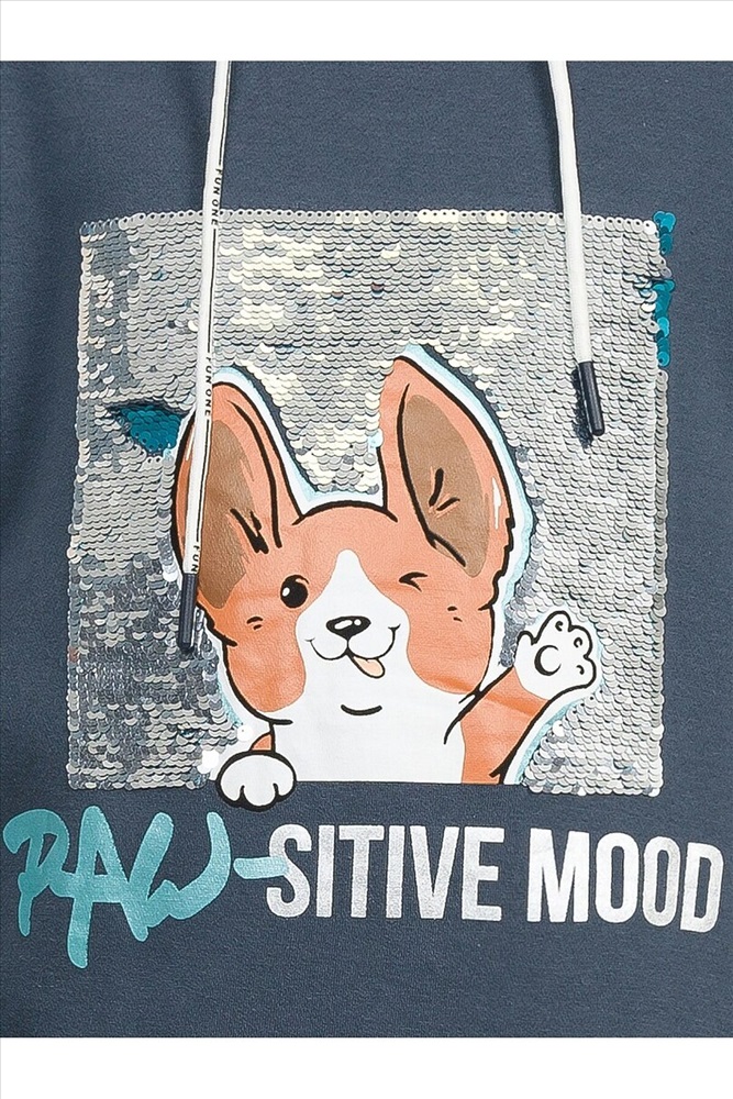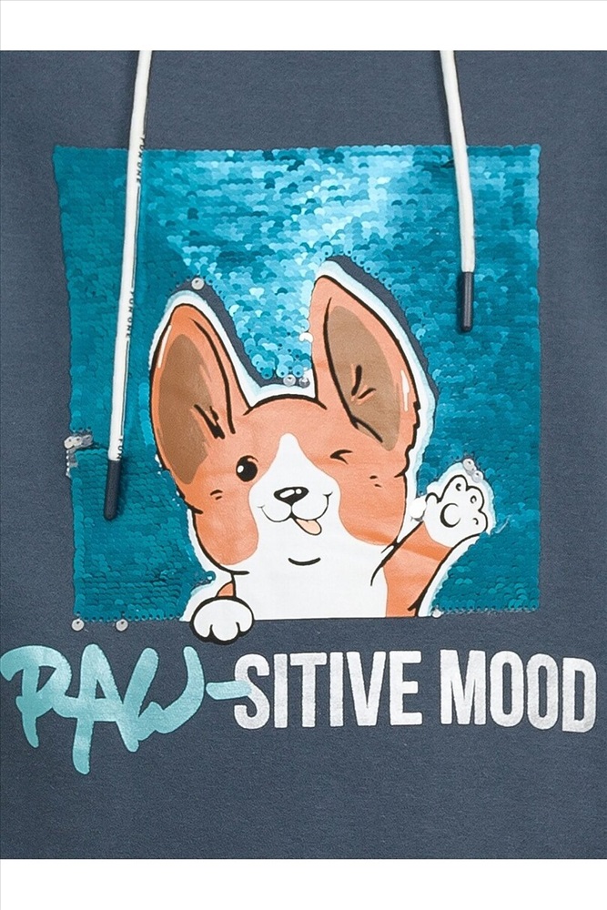 Худи из футера с начесом. Оригинальный капюшон с запахом, объем регулируется принтованными шнурками с пластиковыми наконечниками. По краю капюшона широкая обтачка с текстовым принтом из серебряного металлика. Перевод Не важно. Центральный принт в виде нашивки из двусторонних пайеток, серебряного и бирюзового металликов. Перевод игра слов PAW лапа и POSITIVE позитивное настроение.