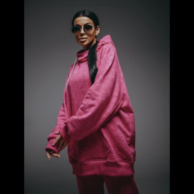 Худи – oversize кроя с притачным поясом по низу, с длинным рукавом реглан на манжете.