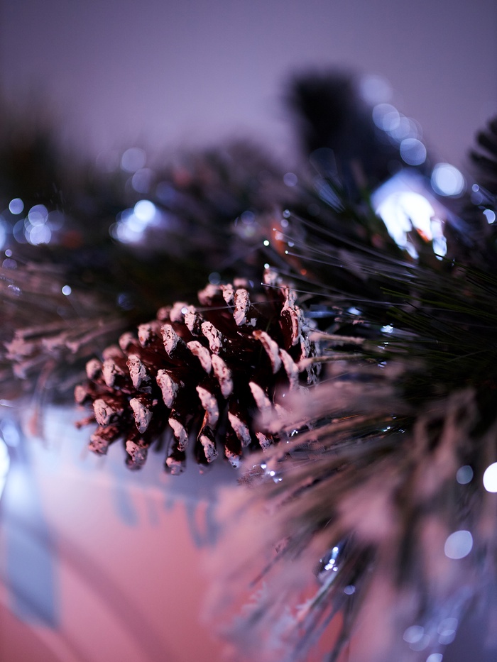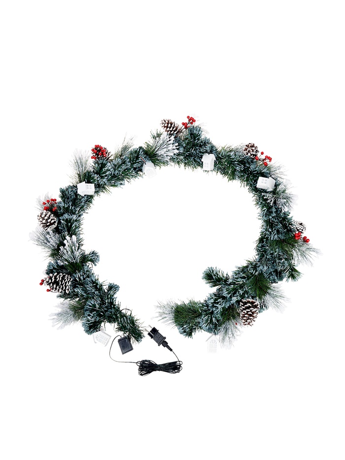 Фиброоптическая гирлянда длиной 200 см создаёт эффект снежного зимнего леса в вашем доме. Отгибающиеся ветки из ПВХ украшены шишками, ягодами и другими элементами декора, а встроенная подсветка белого цвета с восемью режимами работы оживляет интерьер, добавляя праздничного сияния и уюта.