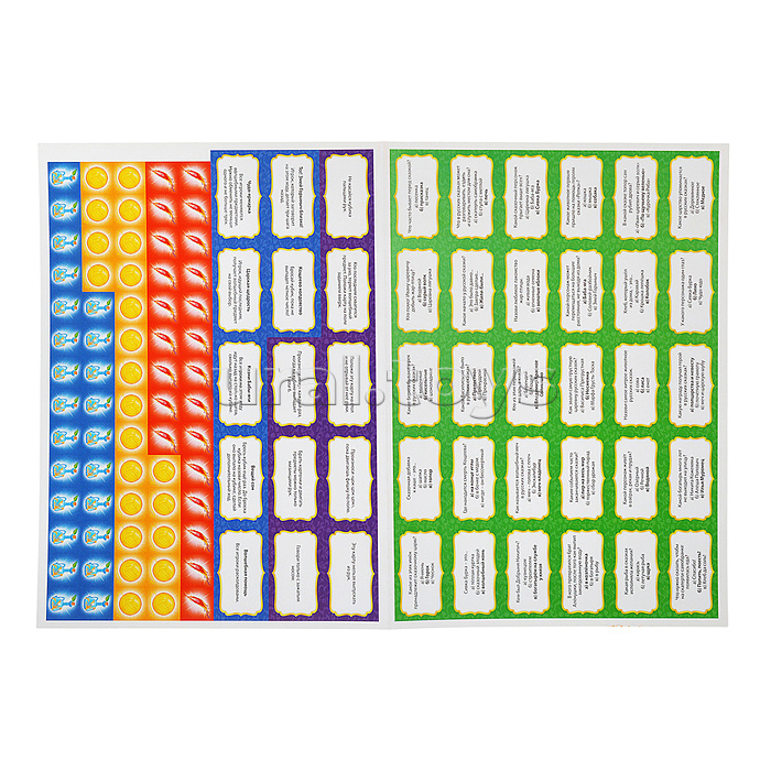 • В наборе: - игровое поле (59.5х42 см.) - разрезные карточки. - правила игры. - 8 фишки. - кубик. • Материалы: бумага, картон, пластик. • Для детей от 6 лет.
