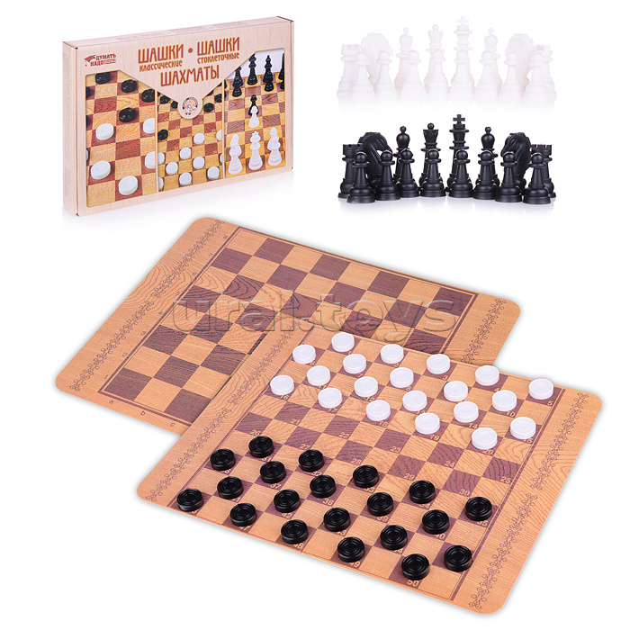 Код: 263956 Страна производитель: Россия Размеры упаковки: 24 x 4 x 37 см Количество в коробке: 5 Набор «Шашки классические, шашки стоклеточные, шахматы» способствует развитию образного мышления, памяти, внимательности, комбинаторики, логического мышления и способности мысленно просчитывать свои шаги на много ходов вперёд, а также скрасит досуг вашего ребёнка весельем и удовольствием. Набор состоит из двухстороннего игрового поля из плотного картона, где одна сторона поля предназначена для игры в шахматы и шашки, а вторая для игры в стоклеточные международные шашки. Края у игрового поля скруглены, и оно легко складывается пополам. Благодаря небольшому весу набора, его удобно брать с собой, отправляясь в путешествие. В комплект входит двухстороннее игровое поле из картона 42 х 32,5 см.; шахматы из пластмассы высотой 6.5 см., 32 шт.; шашки из пластмассы диаметром 2,8 см, высотой 0,8 см., 40 шт. Материалы: пластик, картон. Соответствует требованиям безопасности продукции. Для детей от 3-х лет. Комментарии к товару