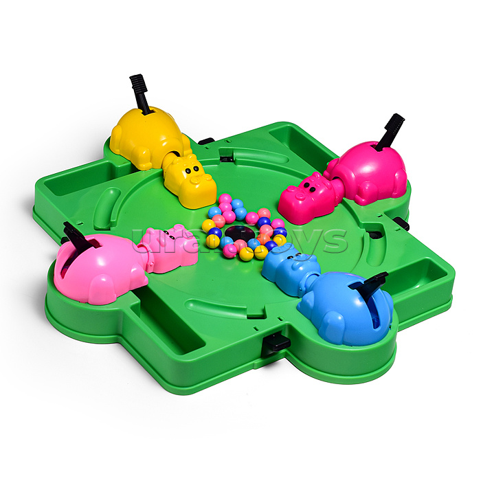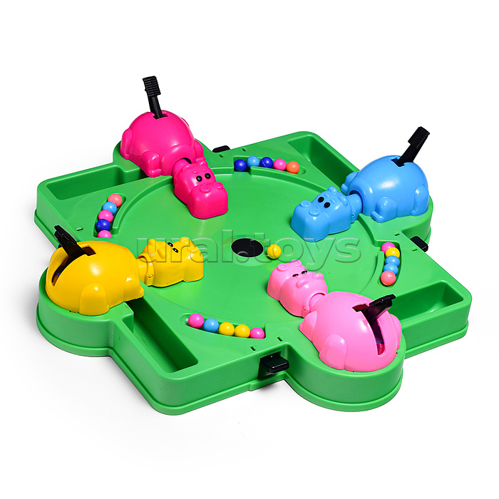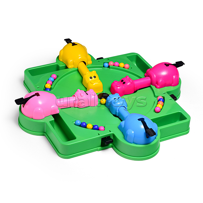Код: 002444 Страна производитель: Россия Размеры упаковки: 41 x 9 x 41 см Количество в коробке: 10 Суть игры заключается в том, чтобы очаровательные цветные бегемотики съели как можно больше шариков. Количество шариков распределяется в начале игры поровну среди игроков. Поочередно каждый игрок скидывает шарик к бегемотикам. На поле не должно быть других шаров, пока один из животных не проглотил сладость. Управлять зверями достаточно просто. На спине у каждого бегемота есть рычаг, при нажатии на который пасть у бегемота раскрывается и удлиняется шея — таким образом бегемот пытается поймать и съесть шарик. Съеденные шарики скатываются в специальный отсек удачливого игрока. Шарики вбрасываются на поле по одному всеми игроками по очереди. Победил тот, у кого больше всех шариков. В комплекте 25 шариков. Играть в Зообильярд могут от 2 до 4 человек одновременно. • Размеры игрового поля: 42х42х8 см. • В комплекте 25 шариков. • Диаметр шариков: 1.3 см. • Материал: пластмасса. • Соответствует требованиям безопасности и стандартам качества продукции. • Для детей от 5 лет. Комментарии к товару