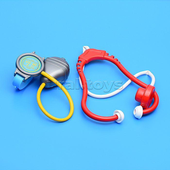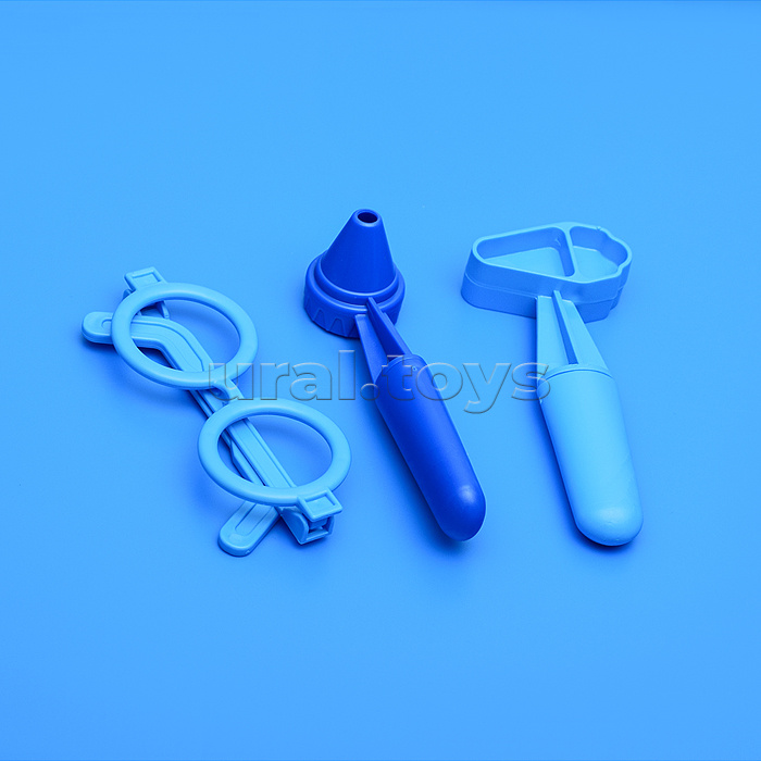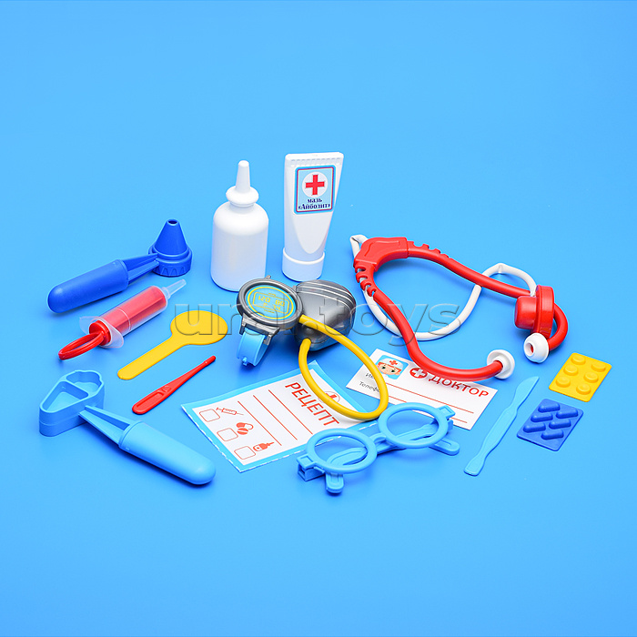 • В наборе 16 предметов: - стетоскоп. - молоток. - отоскоп. - шприц. - очки. - скальпель. - градусник. - ложка. - таблетки муляжи 2 шт. - тонометр. - муляж спрея. - муляж мази. • Материал: пластик. • Соответствует требованиям безопасности и стандартам качества продукции. • Для детей от 3-х лет.