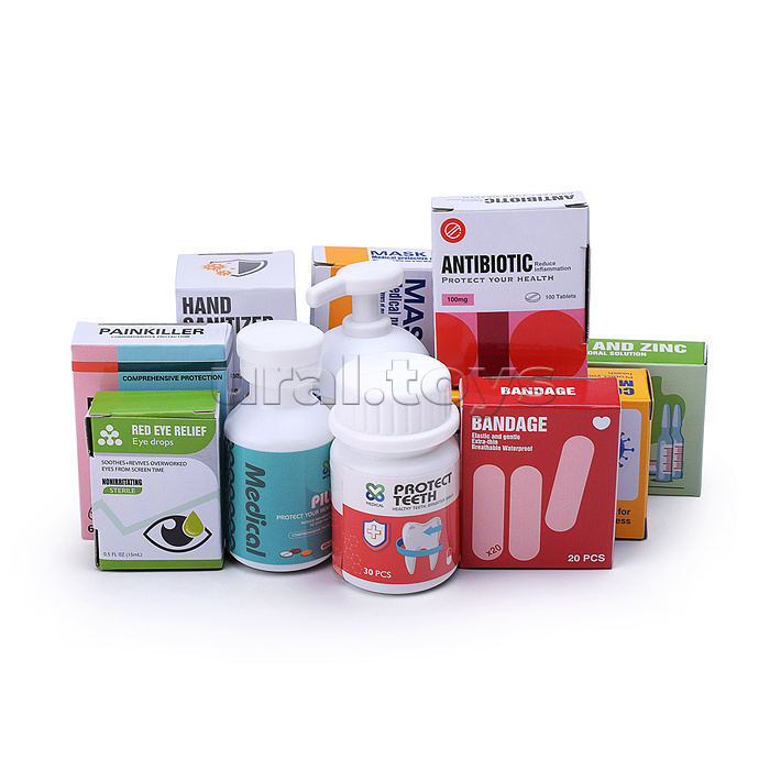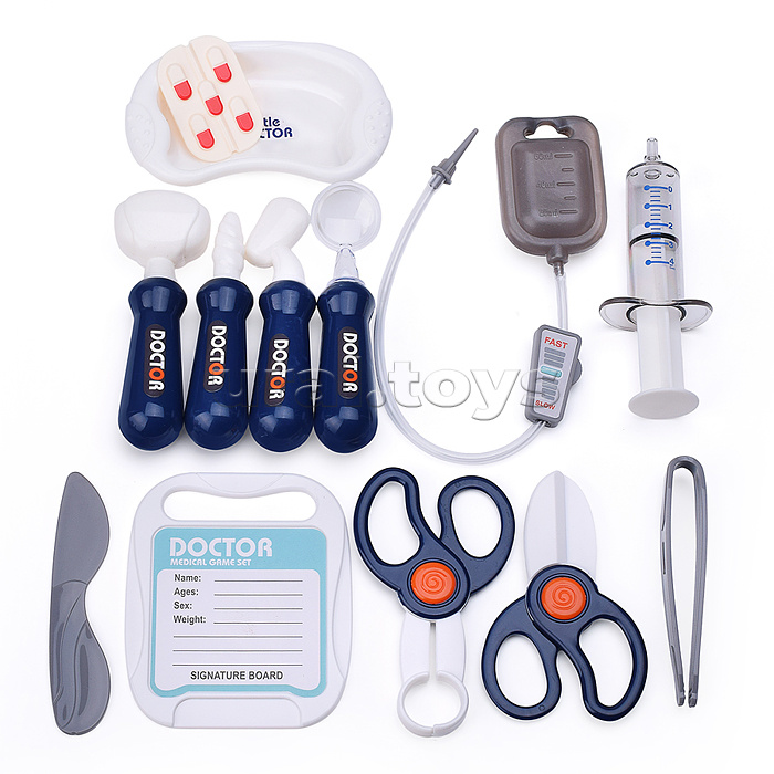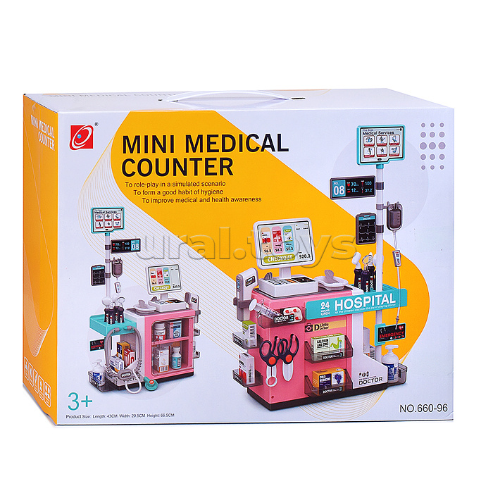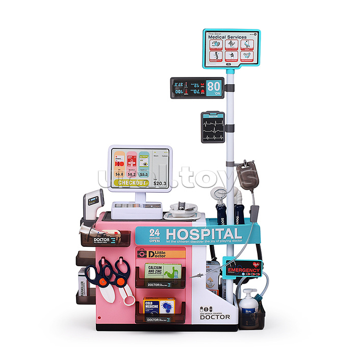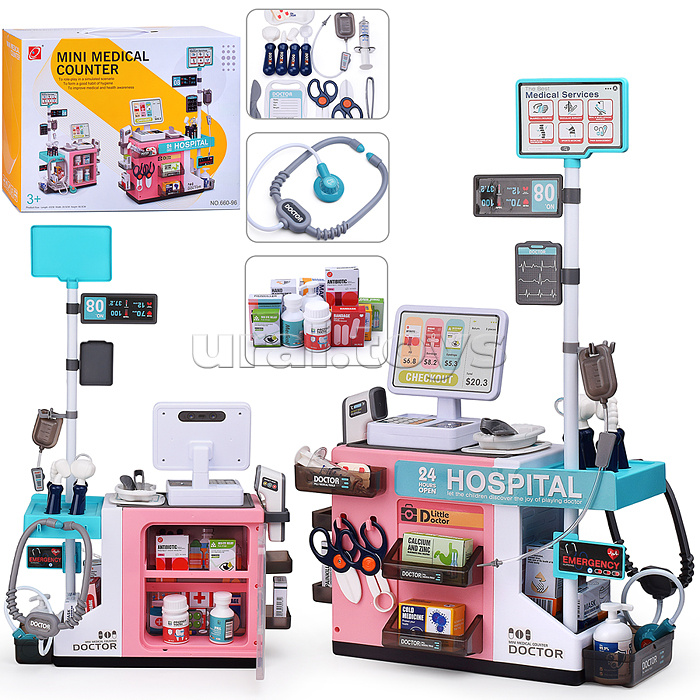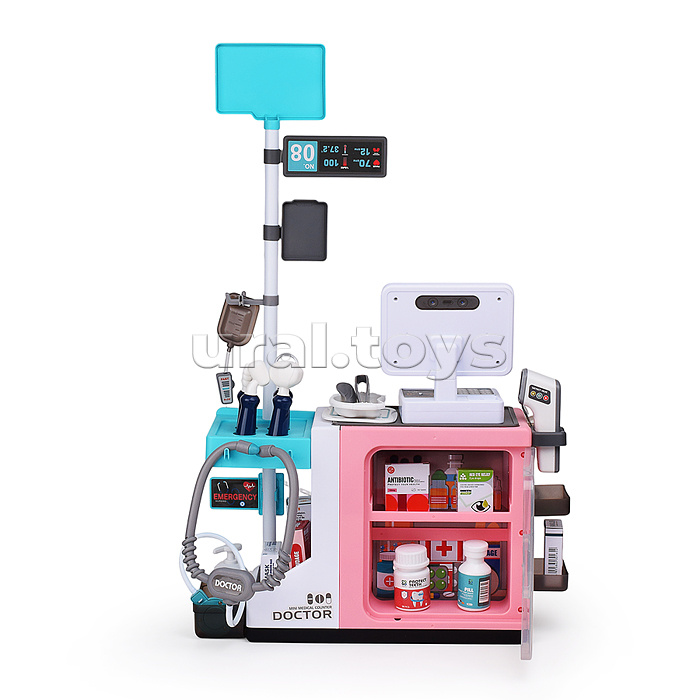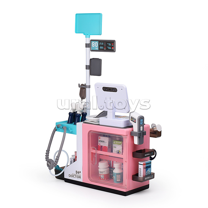 • Размеры игрушки: 43 х 20.5 х 66.5 см. • В комплекте: - касса - работает от 2-х батареек "АА" (не входят в комплект) - термометр - работает от 2-х батареек "ААА" (не входят в комплект) - фонендоскоп - работает от 2-х батареек "AG13" (входят в комплект для демонстрации) - инструменты врача (25 предметов) - игровые деньги (15 банкнот, 6 монет, карта) • Функции кассы: звук оплаты. • Функции термометра: звук сканиования, красная подсветка. • Функции фонендоскопа: звук биения сердца. • Материал: пластик. • Соответствует требованиям безопасности продукции. • Для детей от 3-х лет.