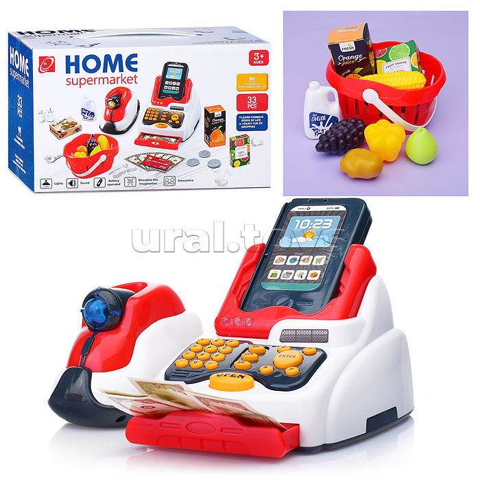 • Размеры кассы: 13х15х12 см. • В комплекте: - корзина для продуктов (14х9х9 см.) - монеты и купюры. - карточка. - фигурки продуктов. • Функции кассы: - денежный ящик открывается с кнопки OPEN, закрывается вручную, - при нажатии на кнопки раздаётся звон и горят лампочки, - разъём для карты со звуковым сигналом, - съёмный терминал оплаты. - сканер со звуком и подсветкой. • Касса работает от 2-х батареек "АА" (не входят в комплект) • Сканер работает от 2-х батареек "АА" (не входят в комплект) • Терминал оплаты работает от 2-х батареек "AА" (не входят в комплект) • Материал: пластик. • Соответствует требованиям безопасности продукции. • Для детей от 3-х лет.