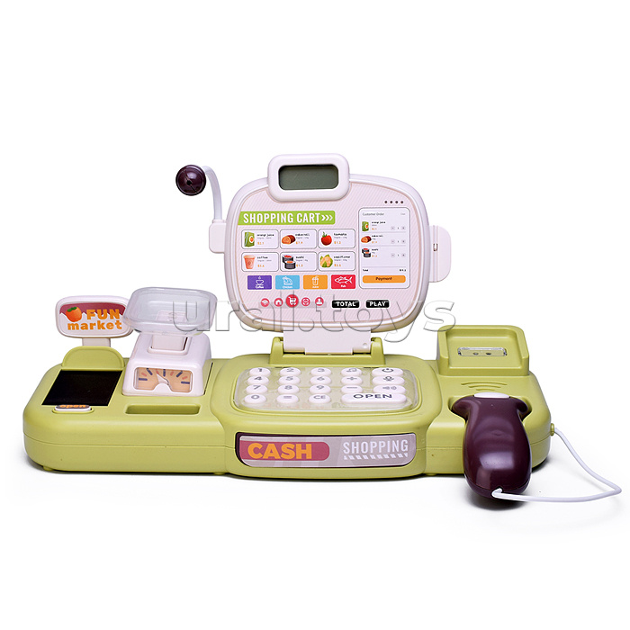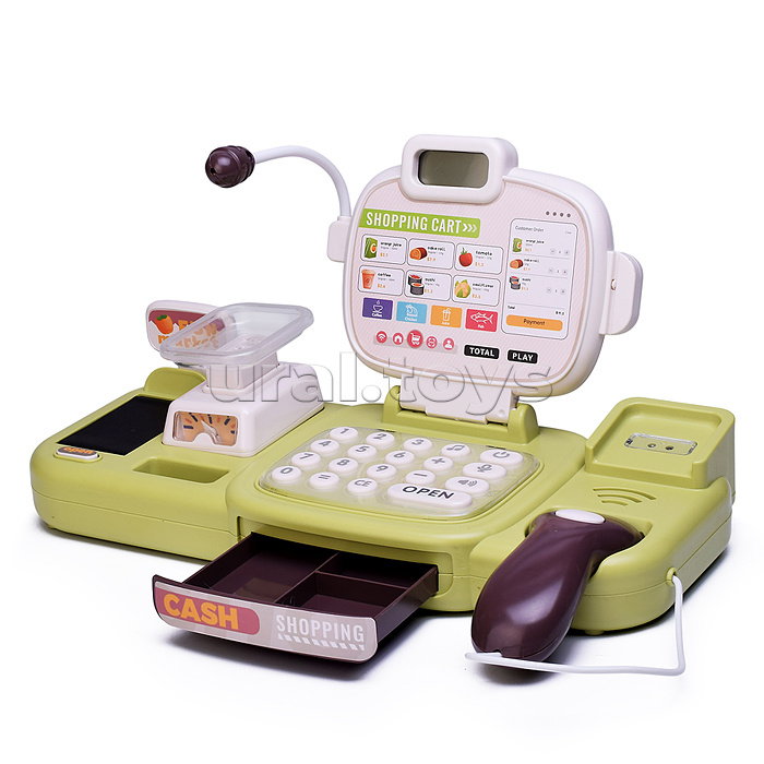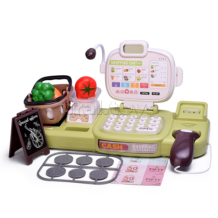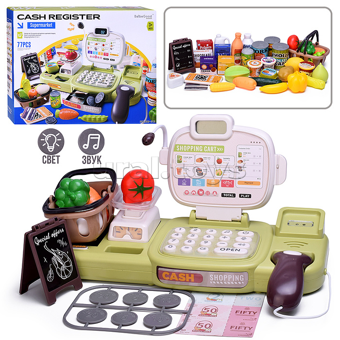 • Размеры кассы: 30,5х13х16 см. • Функции кассы: - калькулятор. - денежный ящик открывается вручную. - мелодии. • Работает от 3-х батареек "АА" (не входят в комплект). • В комплекте: - монеты и купюры. - 2 карточки. - корзина. - продукты. • Материал: пластик. • Соответствует требованиям безопасности продукции. • Для детей от 3-х лет.