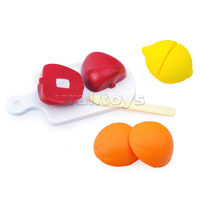 • В наборе: - апельсин (6х6х6 см.). - лимон (6х6х8 см.). - яблоко (6.5х6.5х6.5 см.). - нож (12 см.). - доска разделочная (10х18.5х0.7 см.). • Фрукты состоят из двух половинок, которые соединяются с помощью липучки. • Материал: пластмасса, липучка. • Соответствует требованиям безопасности продукции. • Для детей от 3-х лет.