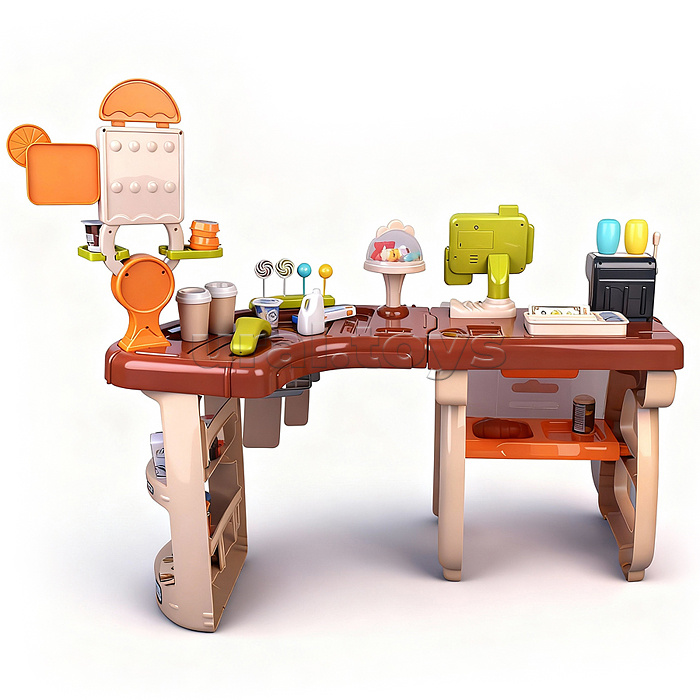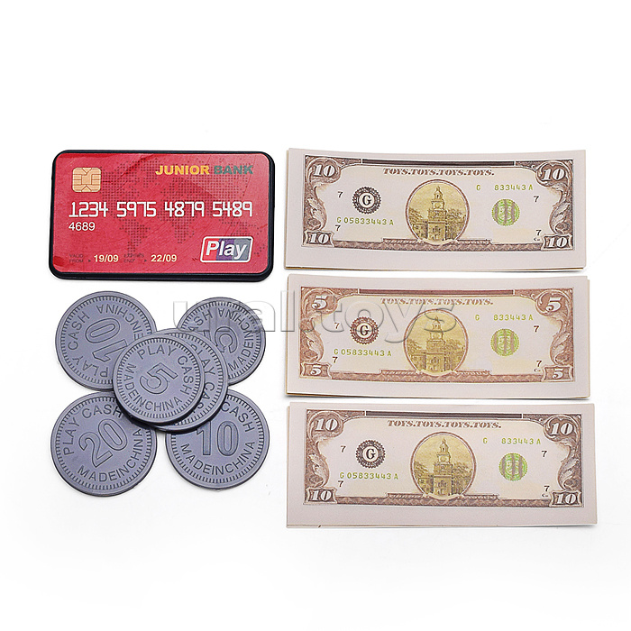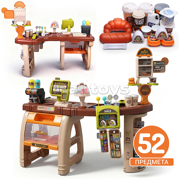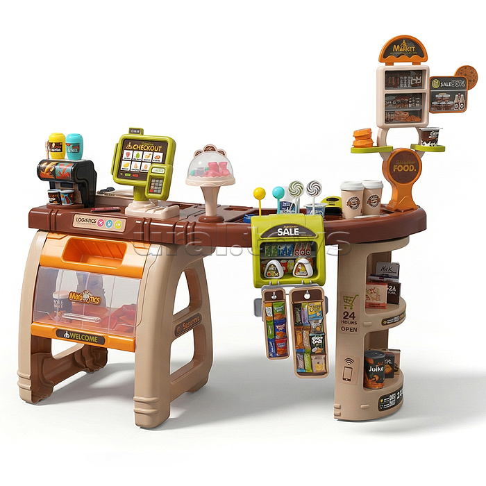Код: 306041 Штрихкод: 6933112225112 Страна производитель: Китай Размеры упаковки: 59 x 20 x 44 см Количество в коробке: 6 • В комплекте: • детали для сборки супермаркета, • 52 аксессуара: ручка сканера (1 шт.), карта (1 шт.), монеты (6 шт.), бумажные купюры (6 шт.), лоток (1 шт.), коробочка (9 шт.), торговая упаковка (10 шт.), бутылка (1 шт.), имитация порционных пакетов сахара (2 шт.), хлебные продукты (2 шт.), конфеты (5 шт.), леденцы на палочке (4 шт.), стаканчики (4 шт.), • Размеры супермаркета (в сборе): длина - 93 см.; ширина - 50 см.; высота - 79 см. • Высота столешницы: 42 см. • Игровые особенности: • кнопка кассы и разъём для карты со звуковым сигналом, • корпус кассы вращается, • ручка сканера с подсветкой и звуковым сигналом, • дверца витрины открывается, • машина для напитков с подвижной ручкой (без подачи напитка). • Касса работает от 2-х батареек "АА" - не входят в комплект. • Сканер работает от 2-х батареек "ААА" - не входят в комплект. • Материал: пластик, картон, бумага. • Соответствует требованиям безопасности продукции. • Для детей от 3-х лет. Комментарии к товару