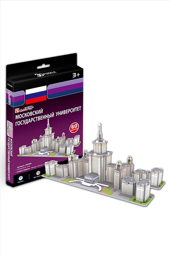 Этот замечательный конструктор-головоломка от Cubic Fun познакомит Вашего ребенка со одним из главных старейших научных учреждений нашей страны – Московским Государственным Университетом имени Ломоносова. По распоряжению И.В. Сталина в 1947 году было спроектировано 8 высотных зданий, которые получили в народе название «сталинские высотки», к ним относится и главный корпус МГУ – великолепное сооружение на Воробьевых горах высотой 240 м в 34 этажа. В архитектурный комплекс также входят боковые пристройки. Юный архитектор сможет собственными руками возвести здание университета прямо у себя дома. Конструктор состоит из 60 деталей которые изготовлены из бумаги и пены EPS, для его сборки не требуются инструменты и клей. Набор имеет 2-й уровень сложности и подходит детям от 5-6 лет. В итоге получится очень реалистичная модель, которая отлично дополнит коллекцию мировых достопримечательностей серии Кубик Фан. Функции: помогает в развитии логики и творческих способностей ребенка; способствует формированию мышления, внимания, восприятия и воображения; развивает моторику рук; расширяет кругозор и стимулирует к познанию новой информации. Практические характеристики: обучающая, яркая и реалистичная модель; идеально и легко собирается без инструментов; увлекательный игровой процесс; тематический ассортимент; новый качественный материал (ламинированный пенокартон).