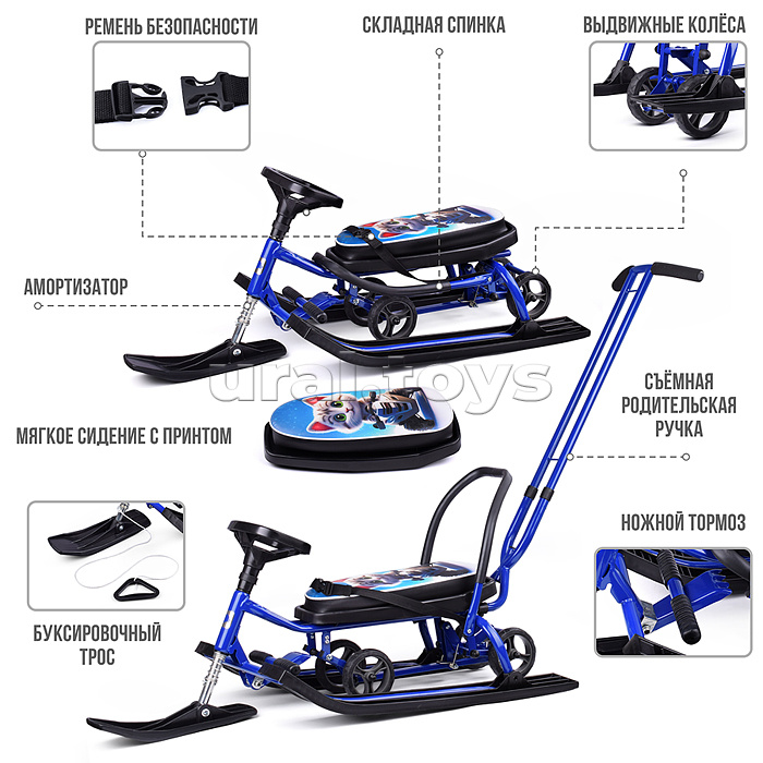 Код: 455805 Штрихкод: 4657762532919 Страна производитель: Россия Размеры упаковки: 81 x 47 x 28 см Количество в коробке: 24 • Размеры снегоката: 1225х485х425 мм. • Высота до сиденья: 275 мм. • Размеры сидения: 440х200 мм. • Ширина колеи: 375 мм. • Ширина лыж: 115 мм. • Сидение из искусственной кожи. • Спинка съёмная, складная. • Съёмная, регулируемая по высоте родительская ручка. • Высота родительской ручки (на колёсах): 109, 112 см. • Выдвижная колёсная база. • Пластиковые колёса с резиновыми накладками. • Диаметр колёс: 125 мм. • Буксировочный трос с пластмассовой ручкой (1200 мм.) • Страховочный ремень на сиденье. • Грузоподъемность: при выдвижении колесной базы - 30 кг, без колесной базы - 100 кг. • Материал каркаса: металл. • Материал лыж: пластик. • Соответствует требованиям безопасности продукции. • Рекомендуемый возраст: от 3-х до 14 лет. • Температура использования: от +1 до -20 градусов. • Вес снегоката: 10.4 кг. Комментарии к товару
