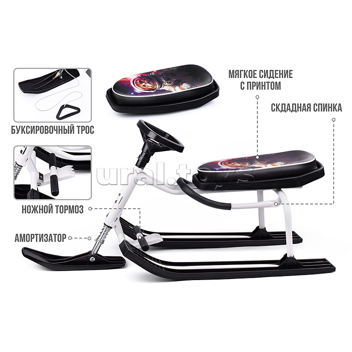 Код: 460708 Страна производитель: Россия Размеры упаковки: 80 x 47 x 38 см Количество в коробке: 1 • Размеры снегоката: 1225х485х425 мм. • Высота до сиденья: 275 мм. • Ширина колеи: 375 мм. • В комплекте буксировочный трос. • Длина буксировочного троса: 120 см. • Грузоподъёмность: не более 100 кг. • Стальная сварная рама. • Лыжи и руль из пластика. • Амортизатор на передней лыже. • Чехол сиденья каучуковый. • Размеры сиденья: 445х195 мм. • Складная съёмная спинка. • Высота спинки: 18 см. • Масса нетто: 8 кг. • Соответствует требованиям безопасности продукции. • Для детей от 3-х до 14 лет. Комментарии к товару