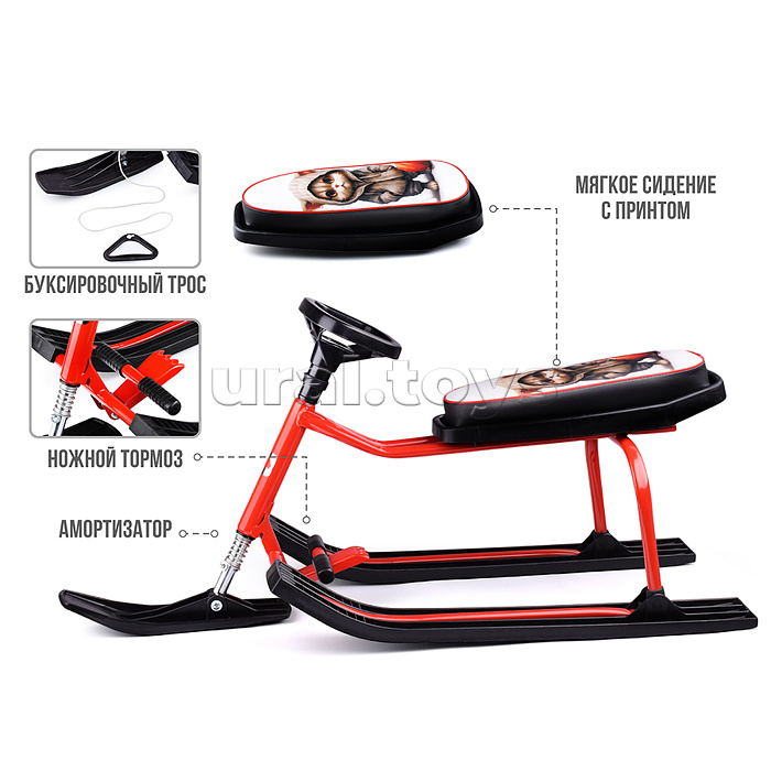 • Размеры снегоката: 122.5х48.5х42.5 см. • Высота сиденья: 35.5 см. • Размер сиденья: 44х19.5 см. • Размер колеи: 37.5 см. • В комплекте буксировочный трос. • Максимальная грузоподъёмность: 100 кг. • Стальная сварная рама. • Лыжи и руль из пластика. • Сиденье из ПВХ. • Вес снегоката: 6 кг. • Соответствует требованиям безопасности продукции. • Для детей от 3-х лет.