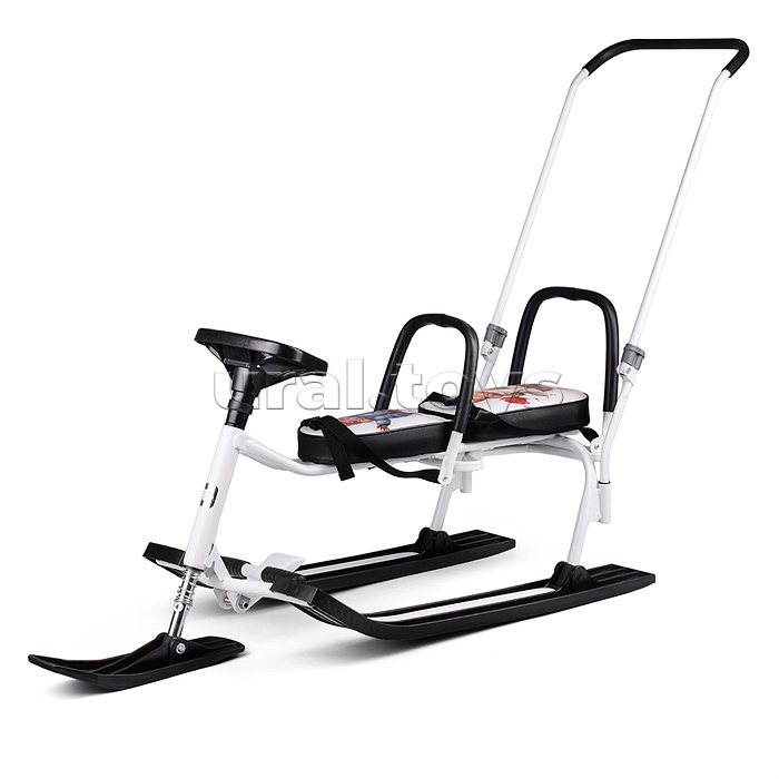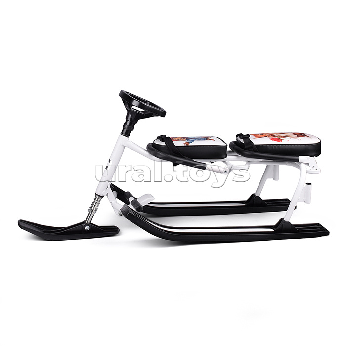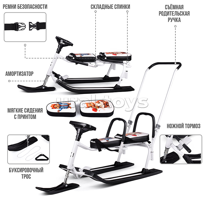• Размеры снегоката: 113х48.5х52 см. • Съёмная ручка-толкатель высотой 96 см. • Высота до сиденья: 28.5 см. • Ширина колеи: 37.5 см. • В комплекте буксировочный трос. • Длина буксировочного троса: 120 см. • Грузоподъёмность: не более 60 кг. • Грузоподъёмность с толкателем: не более 40 кг. • Стальная сварная рама. • Лыжи и руль из пластика. • Амортизатор на передней лыже. • Чехол сиденья каучуковый. • Размеры сиденья: переднее - 28х18 см., заднее - 33х20 см. • Ремни безопасности. • Масса нетто: 9.18 кг. • Соответствует требованиям безопасности продукции. • Для детей от 3-х до 14 лет.