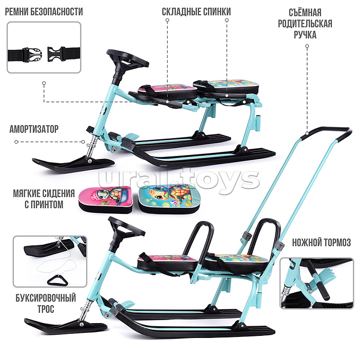 • Размеры снегоката: 113х48.5х52 см. • Съёмная ручка-толкатель высотой 96 см. • Высота до сиденья: 28.5 см. • Ширина колеи: 37.5 см. • В комплекте буксировочный трос. • Длина буксировочного троса: 120 см. • Грузоподъёмность: не более 60 кг. • Грузоподъёмность с толкателем: не более 40 кг. • Стальная сварная рама. • Лыжи и руль из пластика. • Амортизатор на передней лыже. • Чехол сиденья каучуковый. • Размеры сиденья: переднее - 28х18 см., заднее - 33х20 см. • Ремни безопасности. • Масса нетто: 9.18 кг. • Соответствует требованиям безопасности продукции. • Для детей от 3-х до 14 лет.