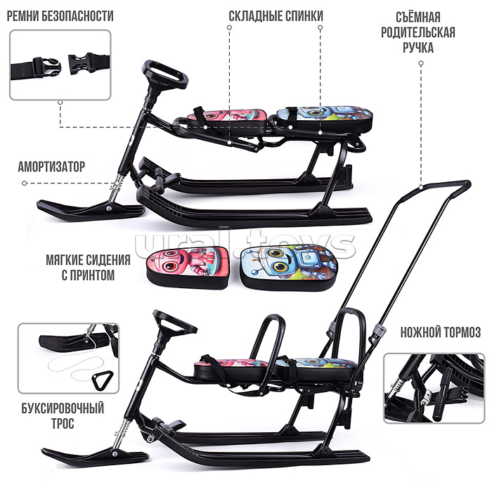 Код: 455514 Штрихкод: 4657762533275 Страна производитель: Россия Размеры упаковки: 81 x 47 x 38 см Количество в коробке: 1 • Размеры снегоката: 113х48.5х52 см. • Съёмная ручка-толкатель высотой 96 см. • Высота до сиденья: 28.5 см. • Ширина колеи: 37.5 см. • В комплекте буксировочный трос. • Длина буксировочного троса: 120 см. • Грузоподъёмность: не более 60 кг. • Грузоподъёмность с толкателем: не более 40 кг. • Стальная сварная рама. • Лыжи и руль из пластика. • Амортизатор на передней лыже. • Чехол сиденья каучуковый. • Размеры сиденья: переднее - 28х18 см., заднее - 33х20 см. • Ремни безопасности. • Масса нетто: 9.18 кг. • Соответствует требованиям безопасности продукции. • Для детей от 3-х до 14 лет. Комментарии к товару
