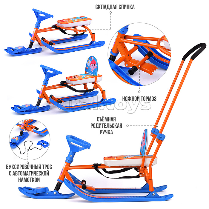 Код: 450013 Штрихкод: 4630111527248 Страна производитель: Россия Размеры упаковки: 74 x 46 x 24.5 см Количество в коробке: 1 Размеры снегоката: 990х405х485 мм. Высота до сиденья: 260 мм. Размеры сиденья: 340х190 мм. Ширина лыж: 85 мм. Съёмная ручка-толкатель (высота - 990 мм). Буксировочный трос с автонамоткой. Длина буксировочного троса: 1100 мм. Вес снегоката: 5.8 кг. Рекомендованный возраст: от 3-х лет. Максимальная нагрузка: 60 кг. Набор наклеек в комплекте. Усиленный широкий тормоз эффективен на заснеженной и обледенелой поверхности. Двухточечный ремень безопасности. Стальной каркас. Пластиковые лыжи. Материалы сиденья: древесная плита, ткань Oxford, холлофайбер, искуственная кожа. Комментарии к товару