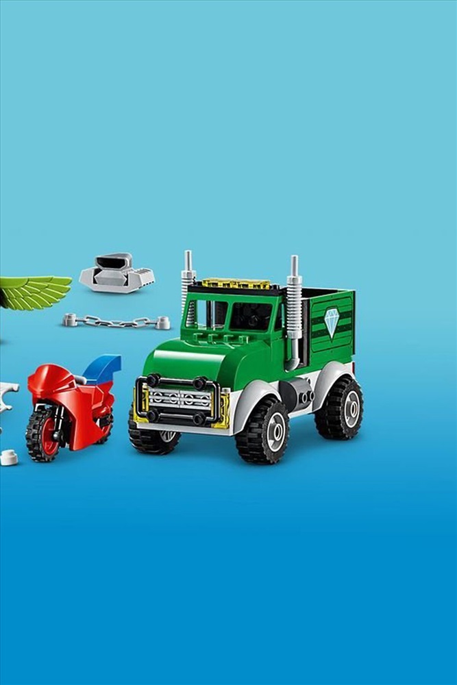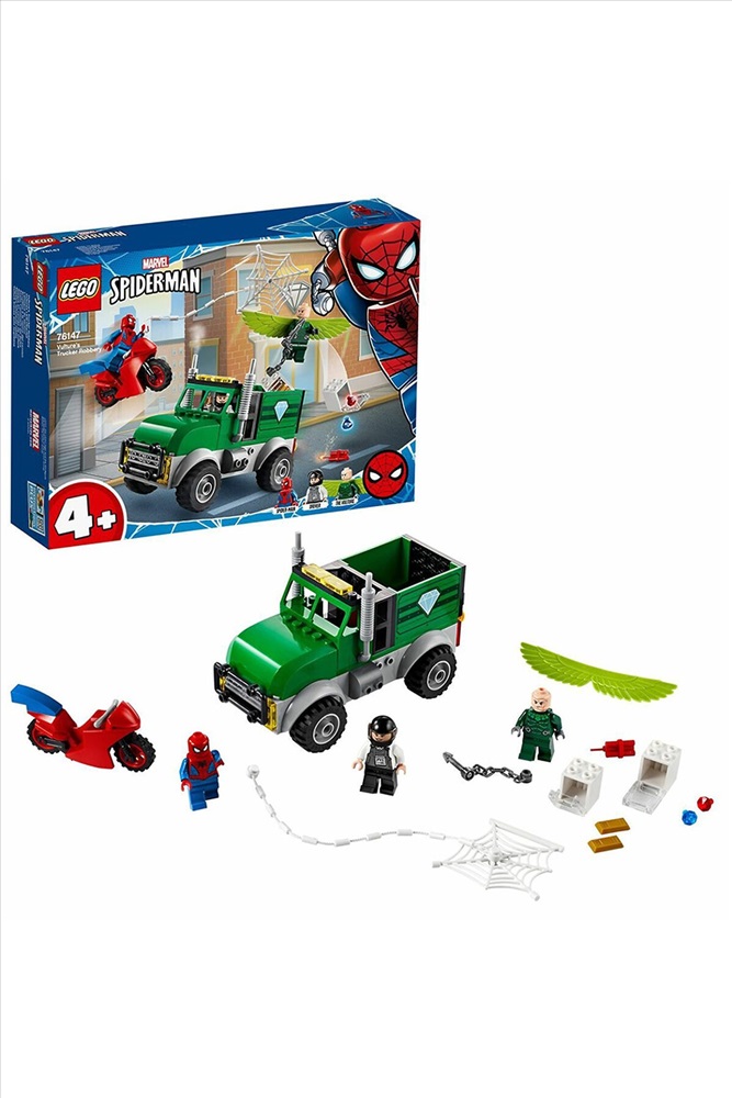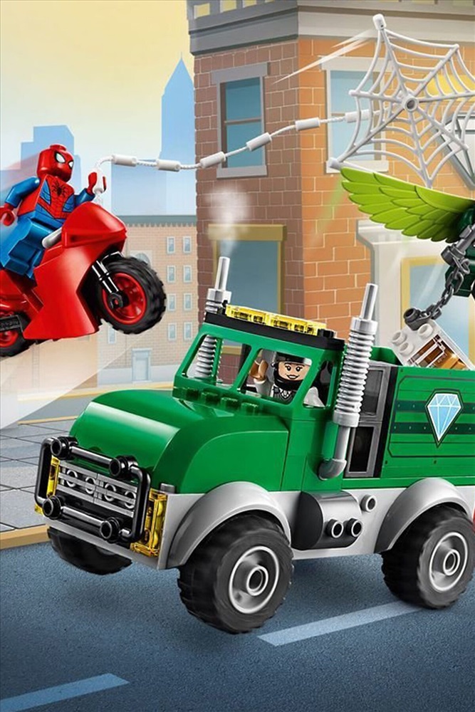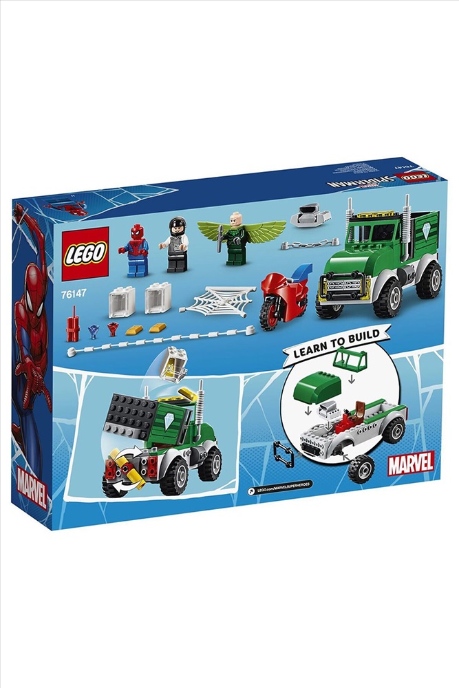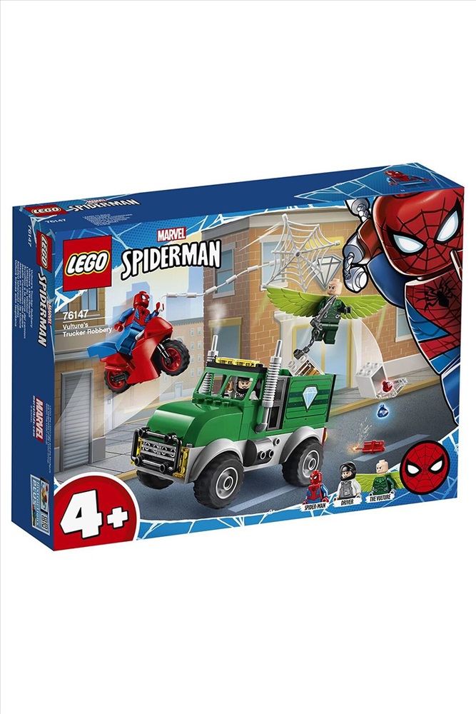 Конструктор LEGO Marvel Super Heroes 76147 «Ограбление Стервятника» предлагает юным искателям приключений не допустить свершение очередной несправедливости! Случилась неприятность: злодей Стервятник взорвал грузовик и хочет забрать драгоценности, которые там находятся. Однако сейчас не время для паники: конструктор с супергероями содержит еще и минифигурку Человека-паука, который уже мчится на помощь. Дети могут присоединиться к нему и вместе принять бой с суперзлодеем. Если ребенок увлекается приключениями героев вселенной Марвел, то такой вариант станет прекрасным подарком ребенку на 7 лет. Имеется функция «взрыва» задней стенки. Двигатель можно установить на капот. Есть сразу 3 минифигурки. В комплекте: Банковский грузовик. Мотоцикл Человека-паука. 3 минифигурки. Аксессуары. Инструкция.